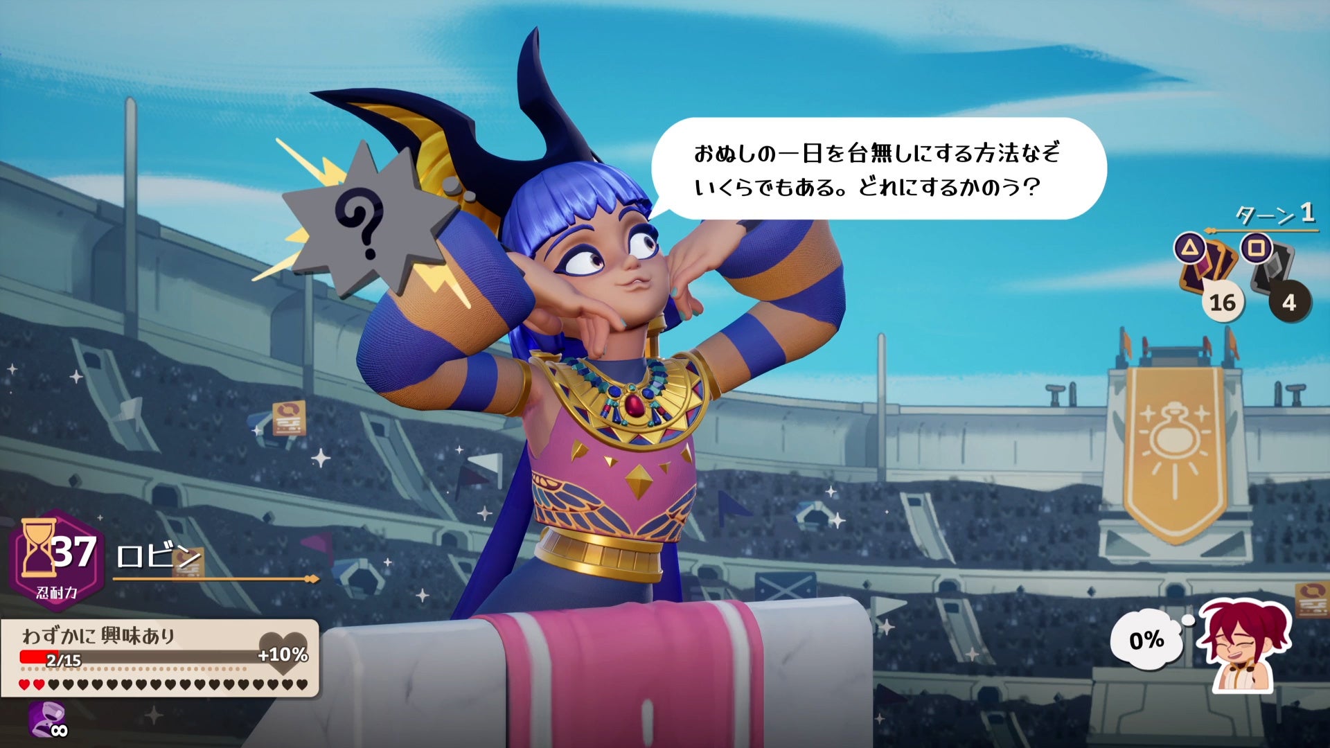 客との交渉はデッキを組んだカードを使用して行われる。「売り口上」や「興味を引く」などで客の関心度を高めていこう。もちろん客も交渉術を駆使してくるので、うまく対応してストレスを溜めないように心がけよう。