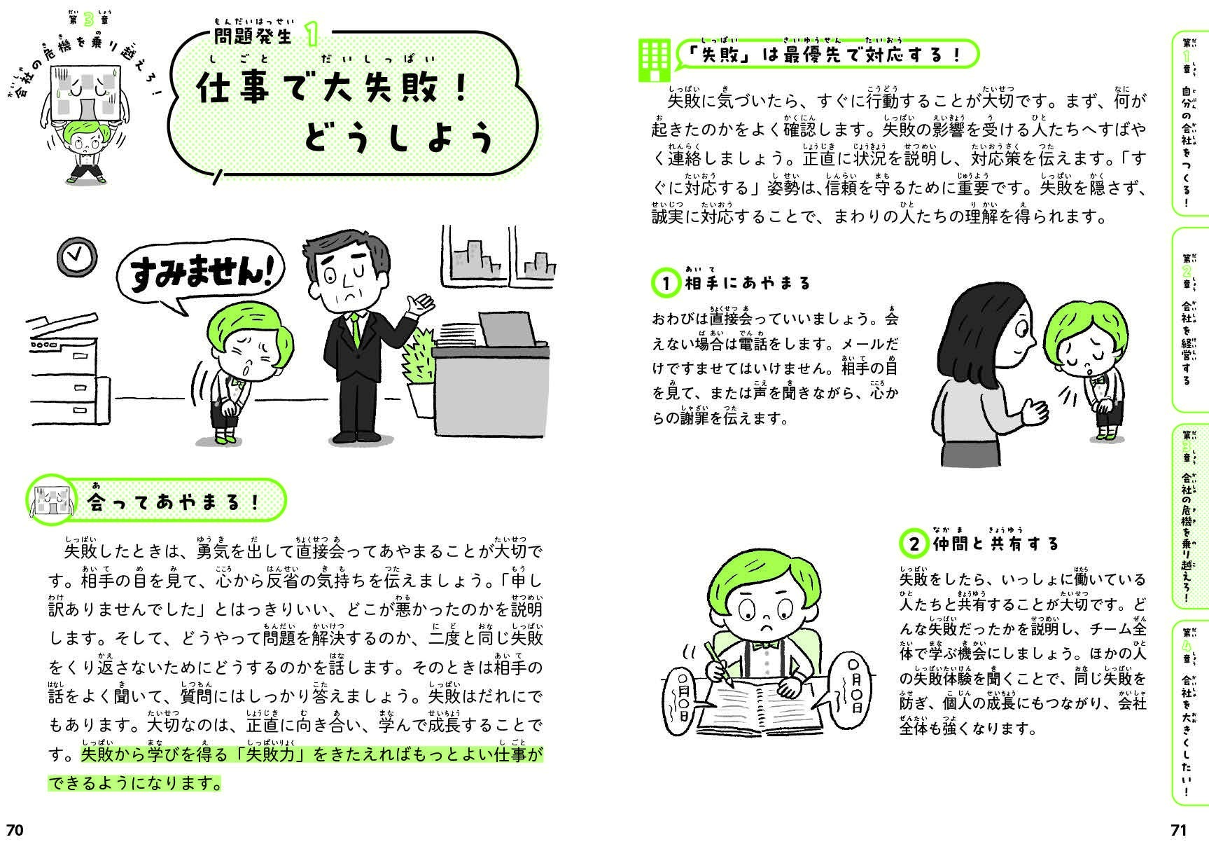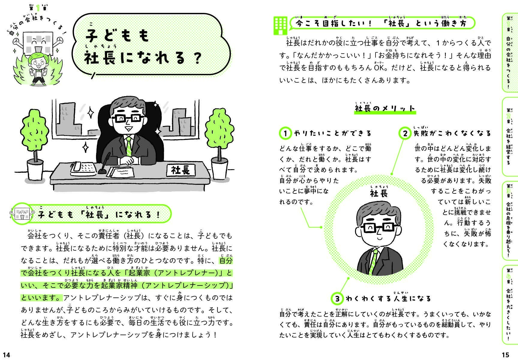子どもでも会社をつくることは可能です。本書では会社づくりの方法から経営の仕方、失敗やピンチに陥ったときの対処法、会社の広げ方や閉じ方まで、イラスト付きでわかりやすく解説していきます。さらに読み進めるうちに自然と起業家精神も身につき、子どもの将来はもとより、日常生活にもたいへん役立つ内容になっています。