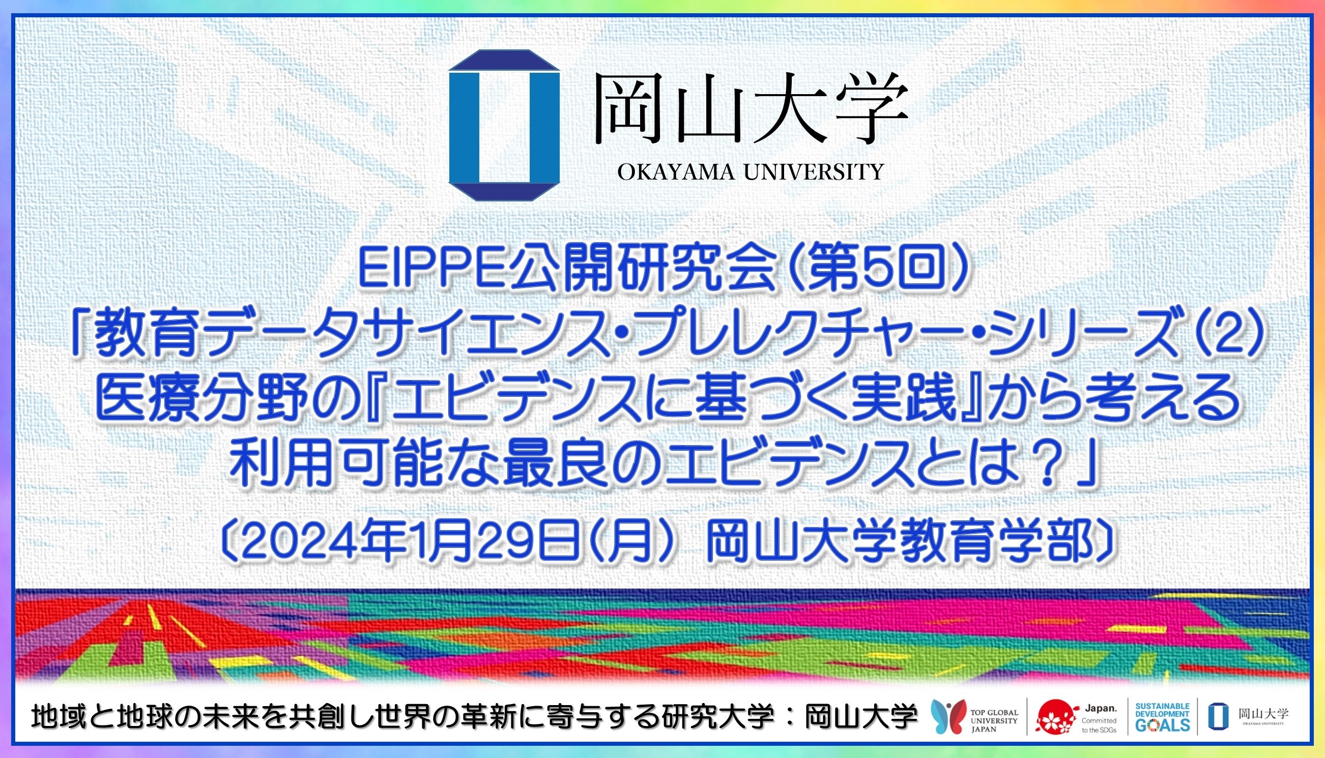 【岡山大学】EIPPE公開研究会(第5回)「教育データサイエンス・プレレクチャー・シリーズ(2)医療分野の『エビデンスに基づく実践』から考える利用可能な最良のエビデンスとは?」〔1/29,月〕