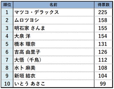 ・「おいしいお店に連れて行ってくれそうな有名人」1位は明石家 さんまさん。交友関係が広そうなイメージがある、ドラマ、バラエティで活躍中の人物がトップ10入り。「2次会のカラオケで歌声にも酔いしれたいアーティスト」は優しい歌声でしっとりと聞かせるアーティストが上位にランクイン