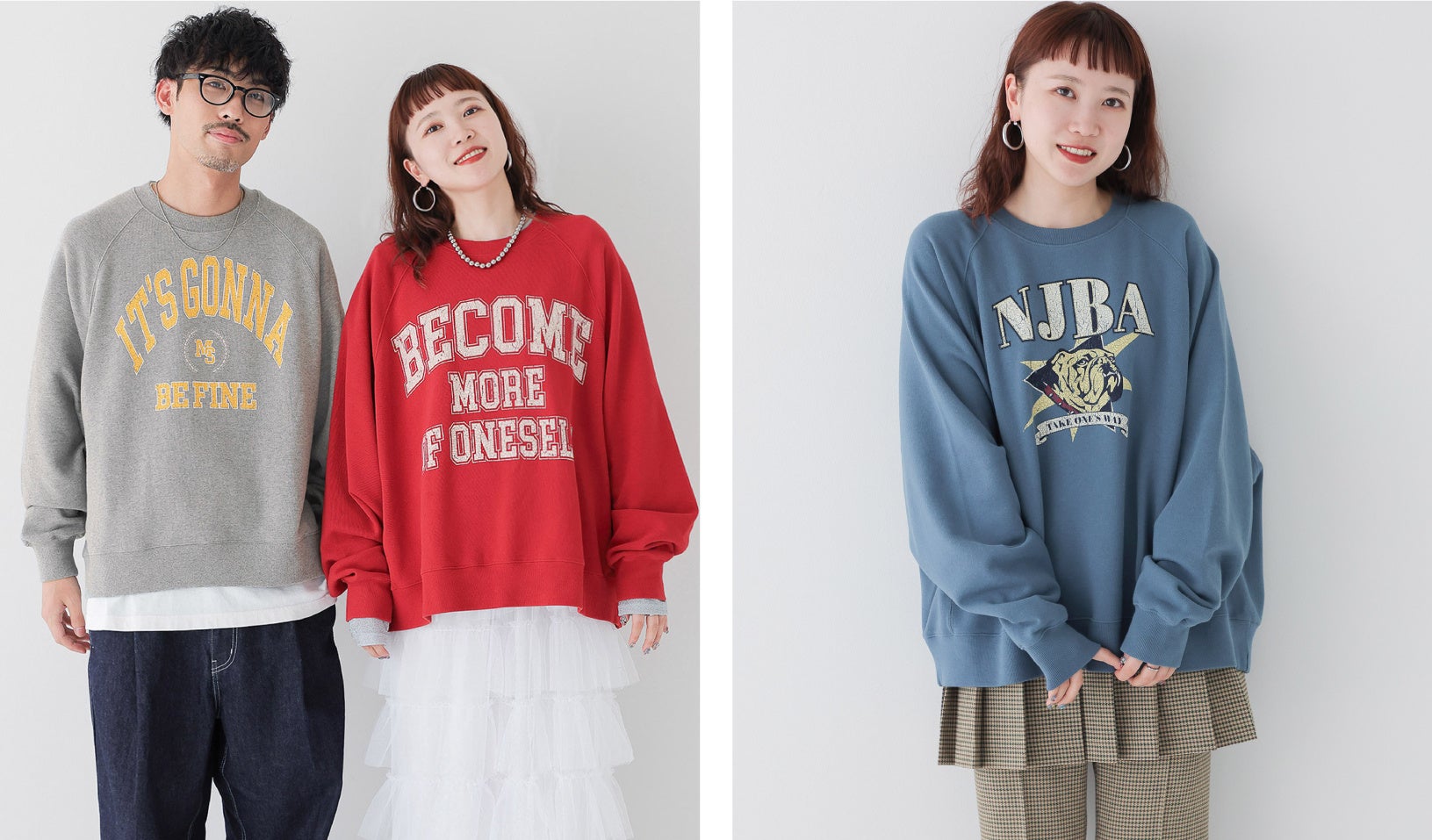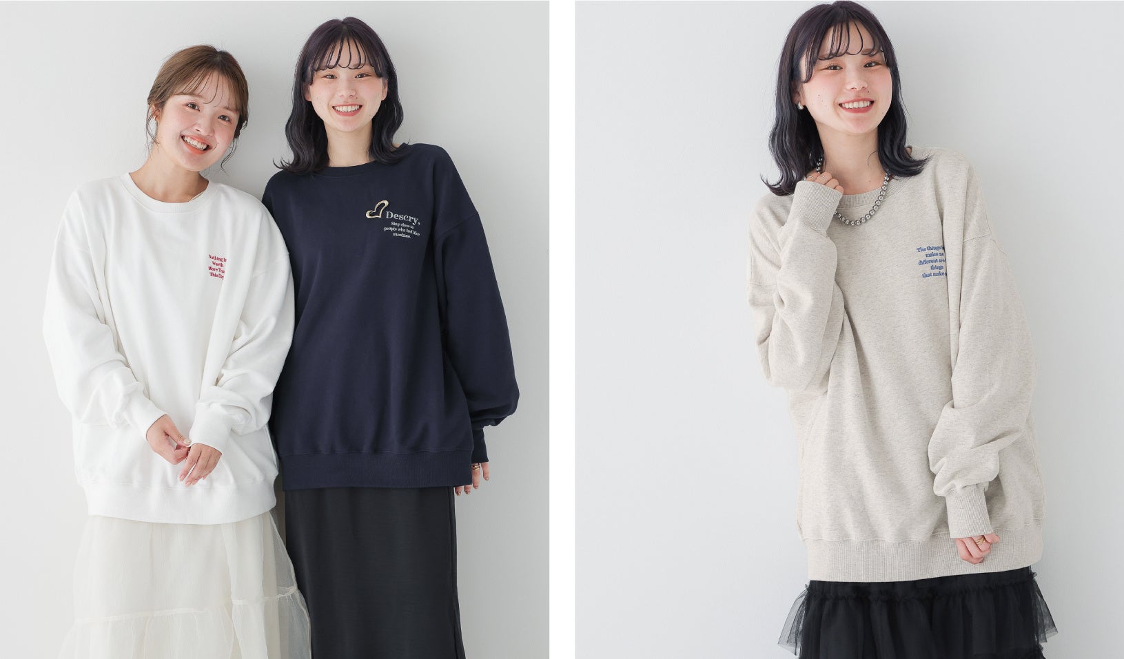 柔らかめの素材を選び、ゆったりとしながらも落ち感のあるシルエットになるようにデザインしました。肩の部分をラグランにしたり、サイドにリブを施すなど細部までこだわりました。3色すべて異なるロゴにして、それぞれ意味も込めて考えました。体型カバーはもちろん着やすくて合わせやすいアイテムです。