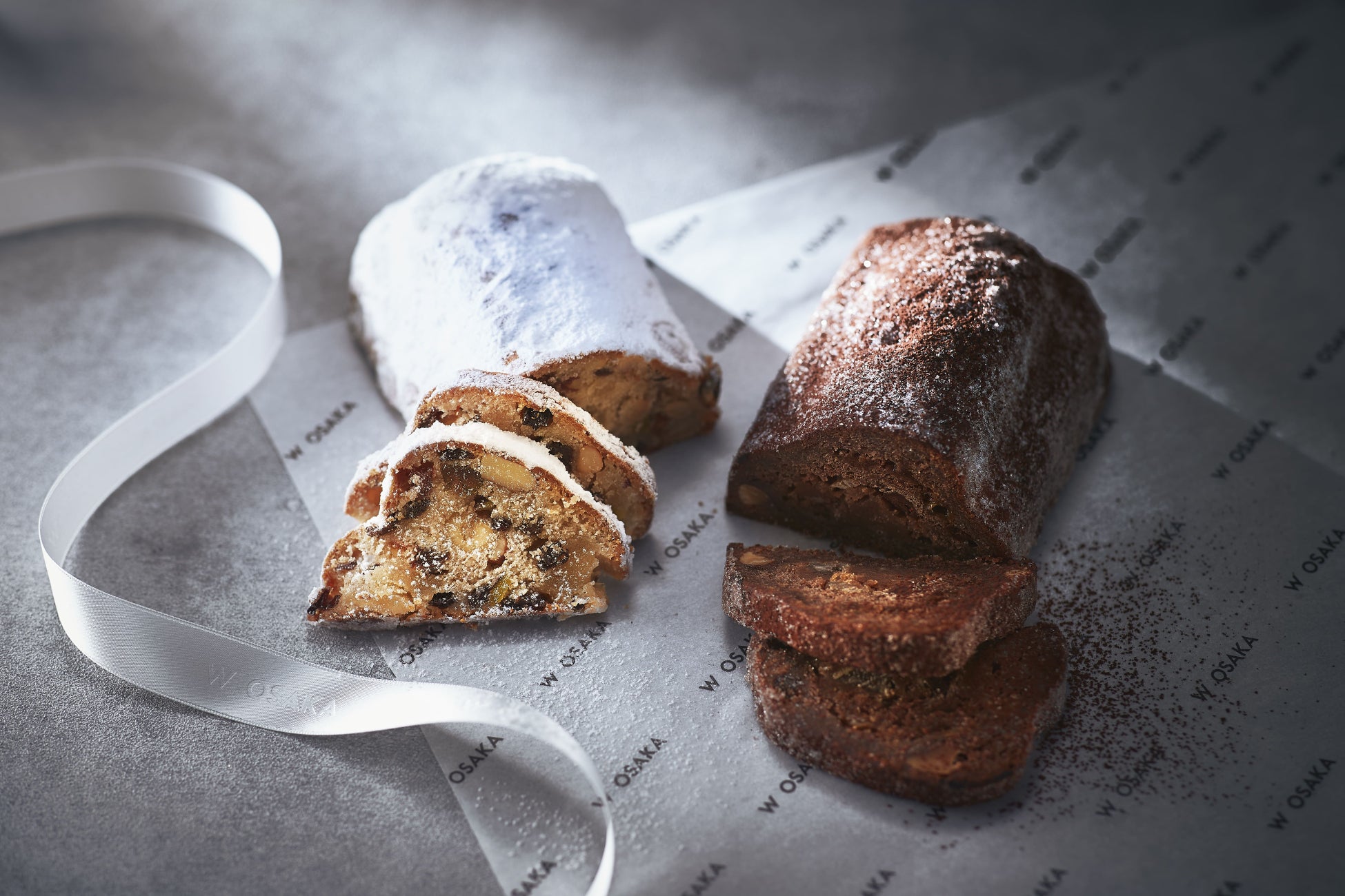 毎年人気のW大阪のオリジナルシュトーレン。今年はラム酒に漬け込んだレーズンとオレンジピールを、アーモンドやピスタチオ、カシューナッツと一緒に生地に練りこみ、焼き上がりを焦がしバターに漬けて深い味わいのシュトーレンに仕上げました。イタリアの栗とマロンペーストが入った、ショコラ風味のマロンショコラシュトーレンも新たに登場!