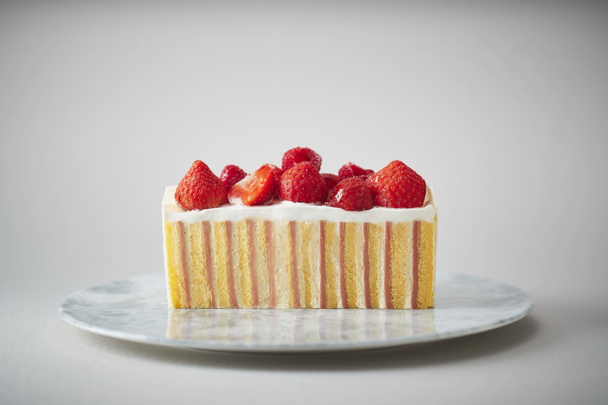 生クリームの下には、苺とグァバ、パッションフルーツのクリームと、平飼い卵を使用したスポンジをレイヤーにして、もっちりとした食感のミルキーなケーキに。カットするとピンクと白のストライプの断面が可愛らしい、お子様にもおすすめの優しい甘さのケーキです。