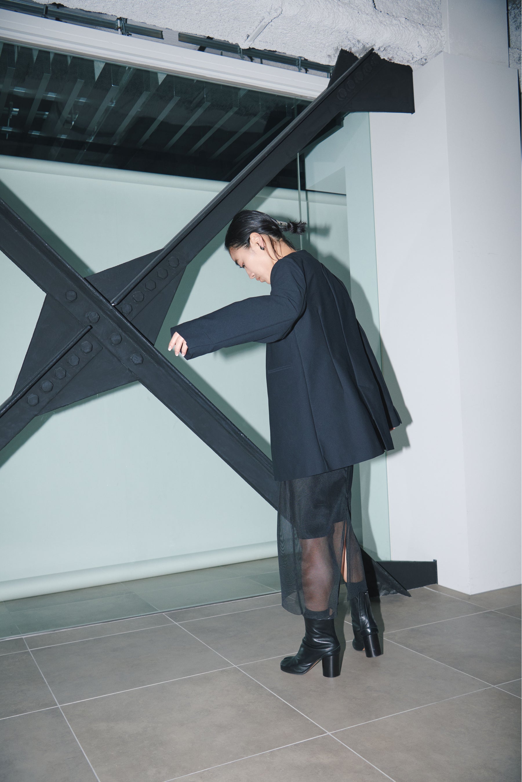 カラーは金子綾さんらしいシックなネイビーをベースに、ポイントでブラックを入れることで、流線的なデザインが際立ち、モードなスタイリングにフィットする一足です。