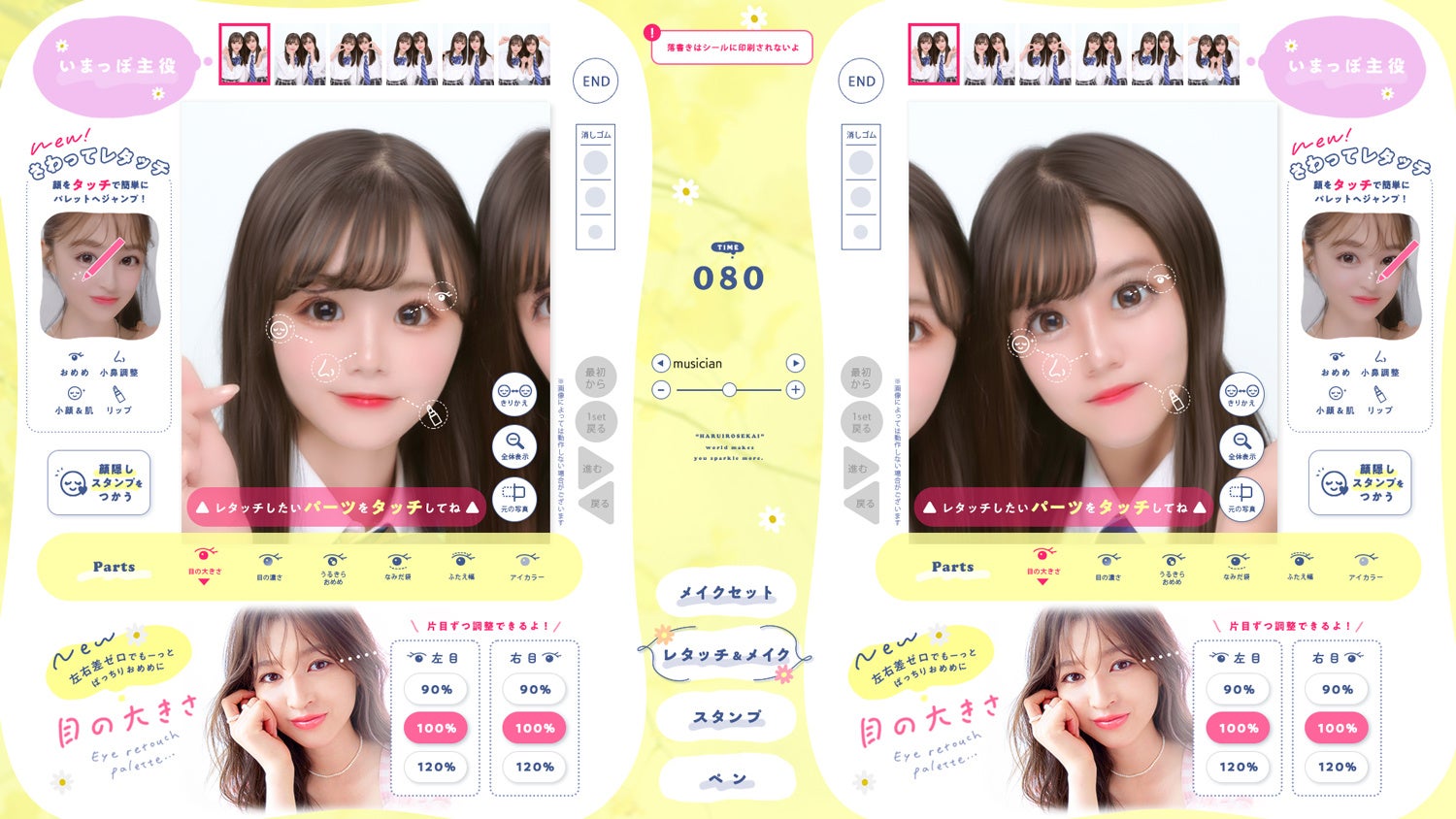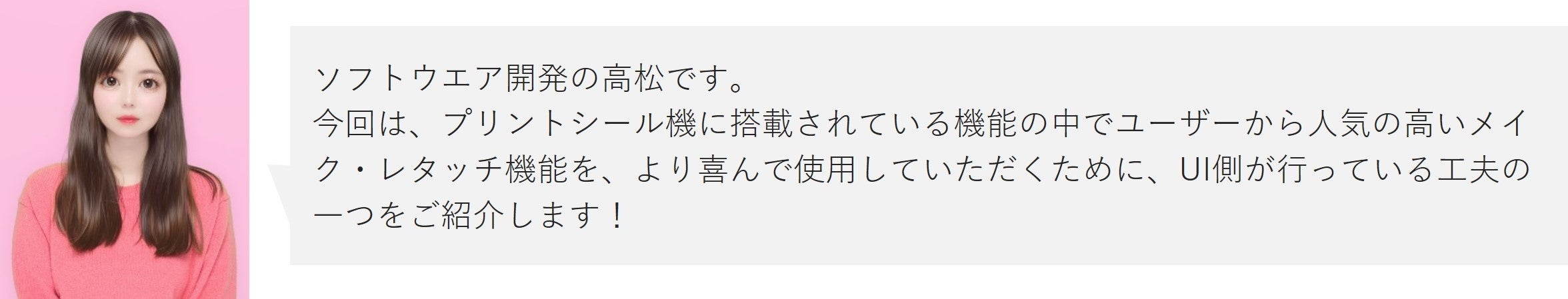 プリントシール(以下、プリ)機には、より自分の顔を理想の盛れ感に近づけるために、そのプリ機のベースの写りに加え、リップの質感や色、まつげ、輪郭の形などをユーザーが変更できるメイク・レタッチ選択機能を搭載しています。そのメイク・レタッチ選択機能を、ユーザーがより快適に、効果的に行うための手段の一つとしてある「顔拡大機能」についてご紹介します。