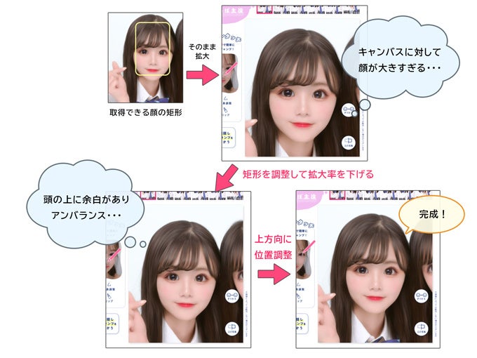 画像処理用の画像から拡大表示したい顔の矩形(くけい。幅・高さ・中心座標)を取得します。取得した矩形を元に、表示する画面(落書き用の画面)サイズに合わせた顔の表示拡大率を計算し、リサイズします。最後に、画面の中央に顔が表示されるよう、座標調整を行っています。