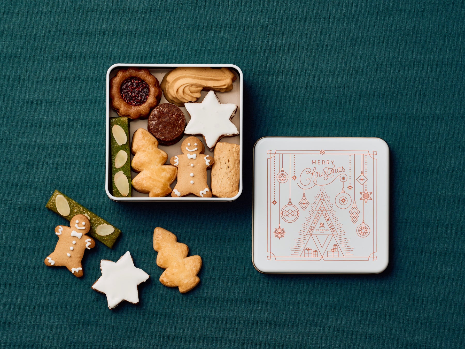 リンツァークッキーや抹茶サブレ、シナモンスター、ツリー型レモンクッキーなど、クリスマスオーナメントのように可愛い形をした8種のクッキーを、クリスマス限定デザインの缶に詰めました。プレゼントにも喜ばれるアイテムです。
