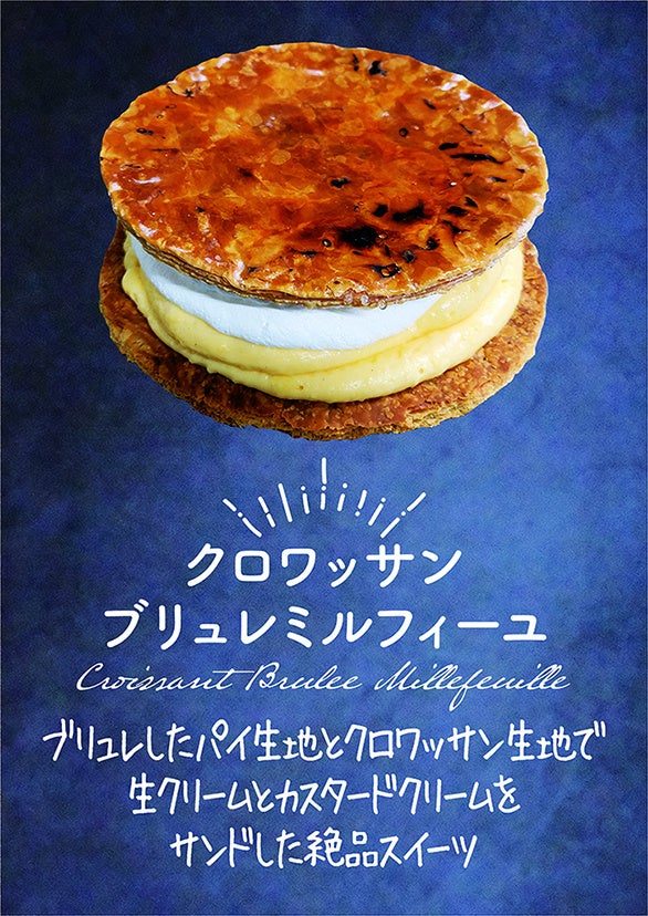 ブリュレしたパイ生地とクロワッサン生地で、生クリームとカスタードクリームをサンドした絶品スイーツ。 さらにクリームの中にはクロワッサンを丸ごと1本使用したラスクもサンドしております。