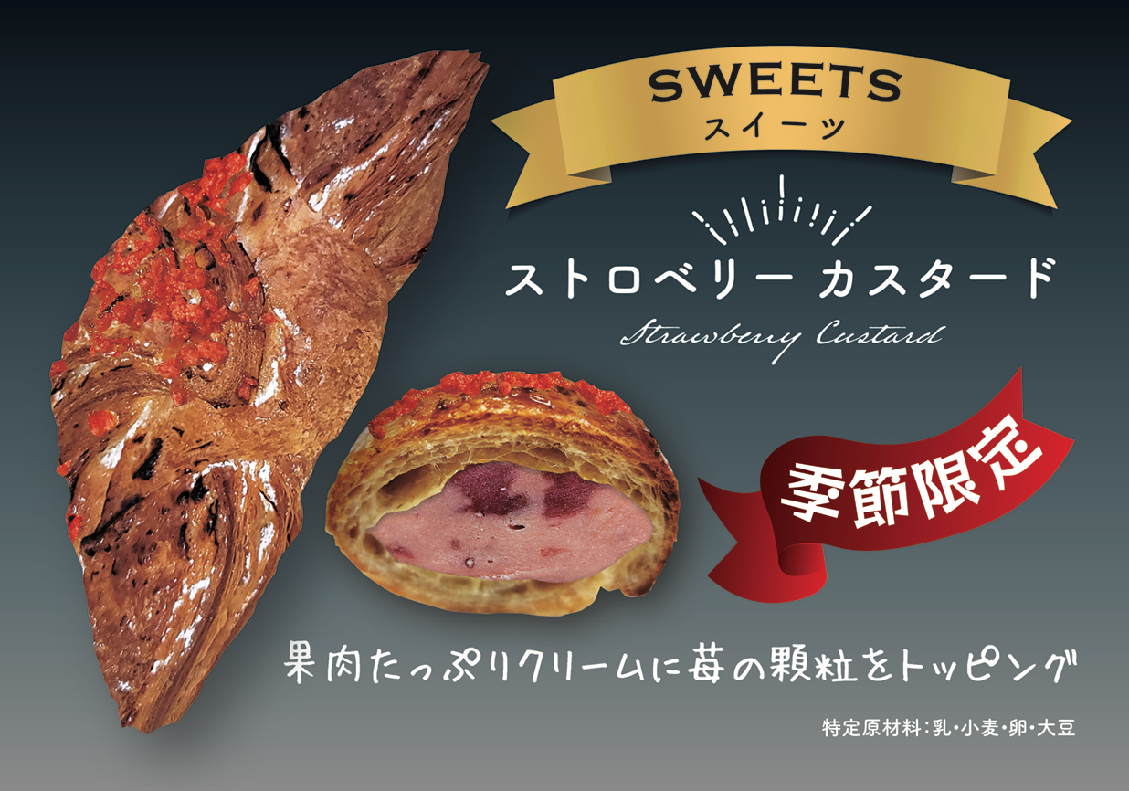 苺の果肉たっぷりクリームに、顆粒をトッピングした苺感満載の季節限定のクロワッサンです。