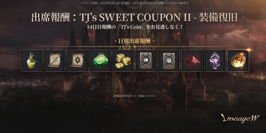 なお14日目の出席報酬で獲得できる「TJコイン」は、ショップメニューから「TJ’s SWEET COUPON II - 装備復旧」に交換できます。「TJ’s SWEET COUPON II - 装備復旧」は、強化失敗により消失した希少級以上の武器、防具、装身具アイテムを1つだけ復旧することが可能です。強化失敗で消失した履歴がない場合は「TJ’s SWEET COUPON II - 装備復旧」を使用して「希少級製作秘法書(刻印)」を製作できます。