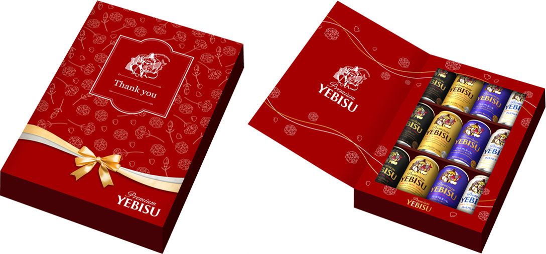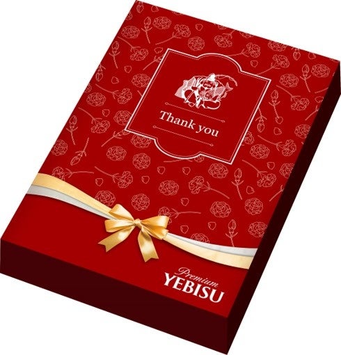 本商品は、カートンにカーネーションのイラストとリボンのデザインをあしらった上品なパッケージにヱビスブランドの商品4種を詰め合わせました。