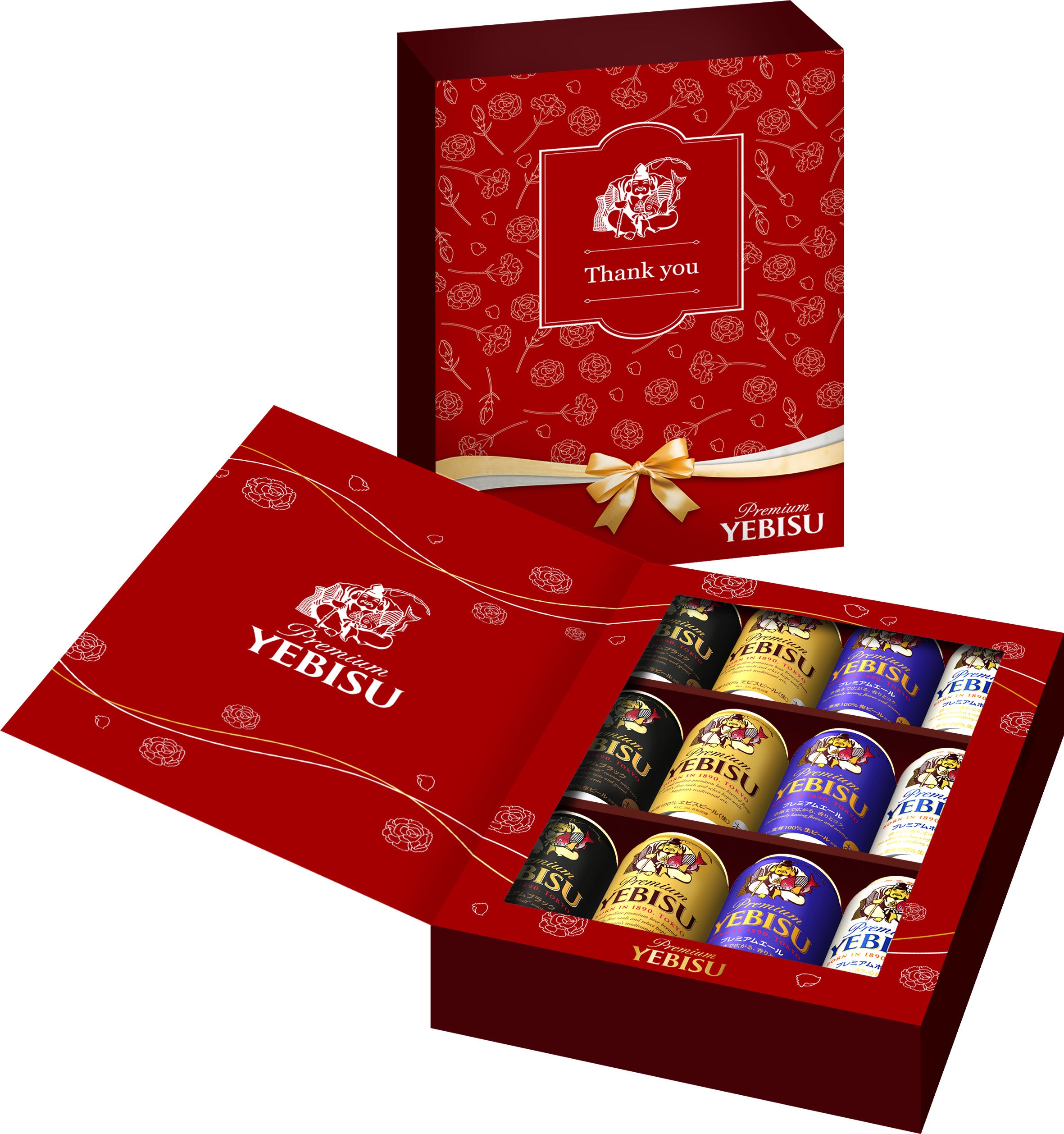 カーネーションとリボンをあしらった上品なカートンに、味わい豊かなヱビス4種各3本セットの母の日ギフトセット