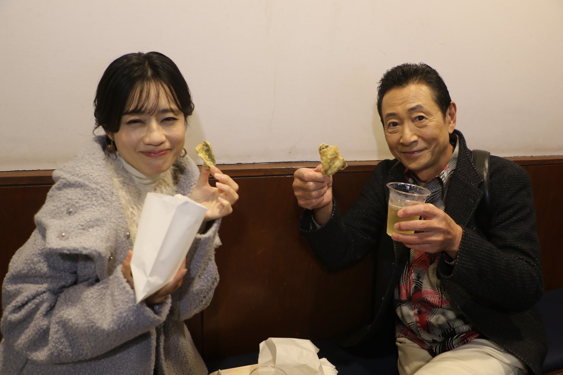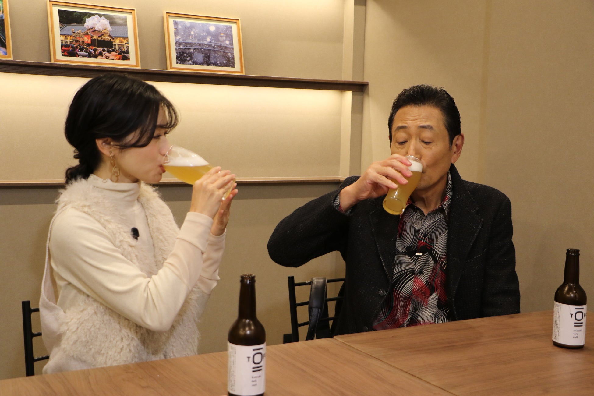 おもしろいことをしたくて、【出石城山ビール製造所】と共同開発したという、豆腐のクラフトビールをいただきます!口をつけた瞬間から豆腐を感じ、その後麦芽の香りがするようです。初めての味わいに2人とも驚愕!