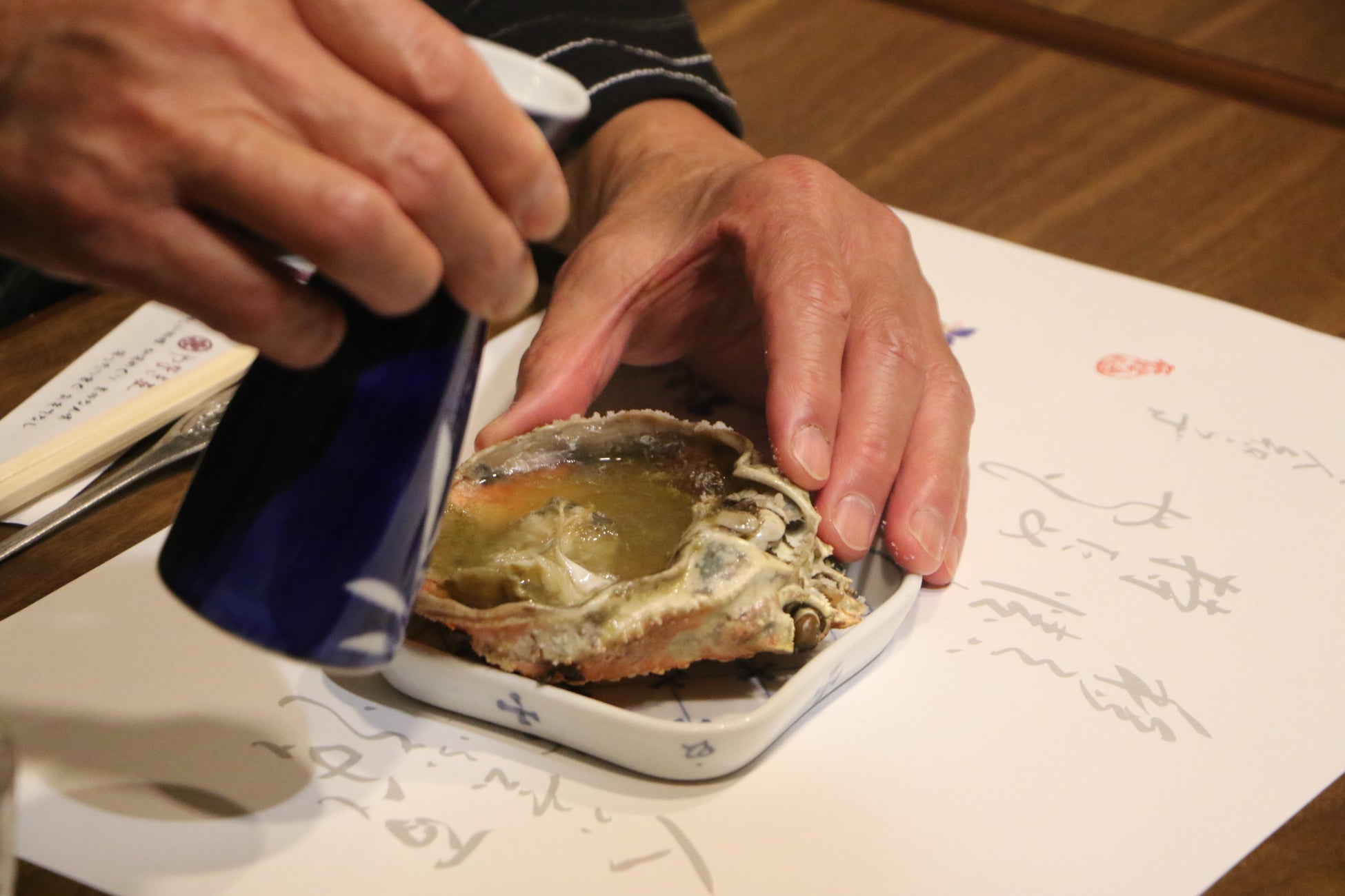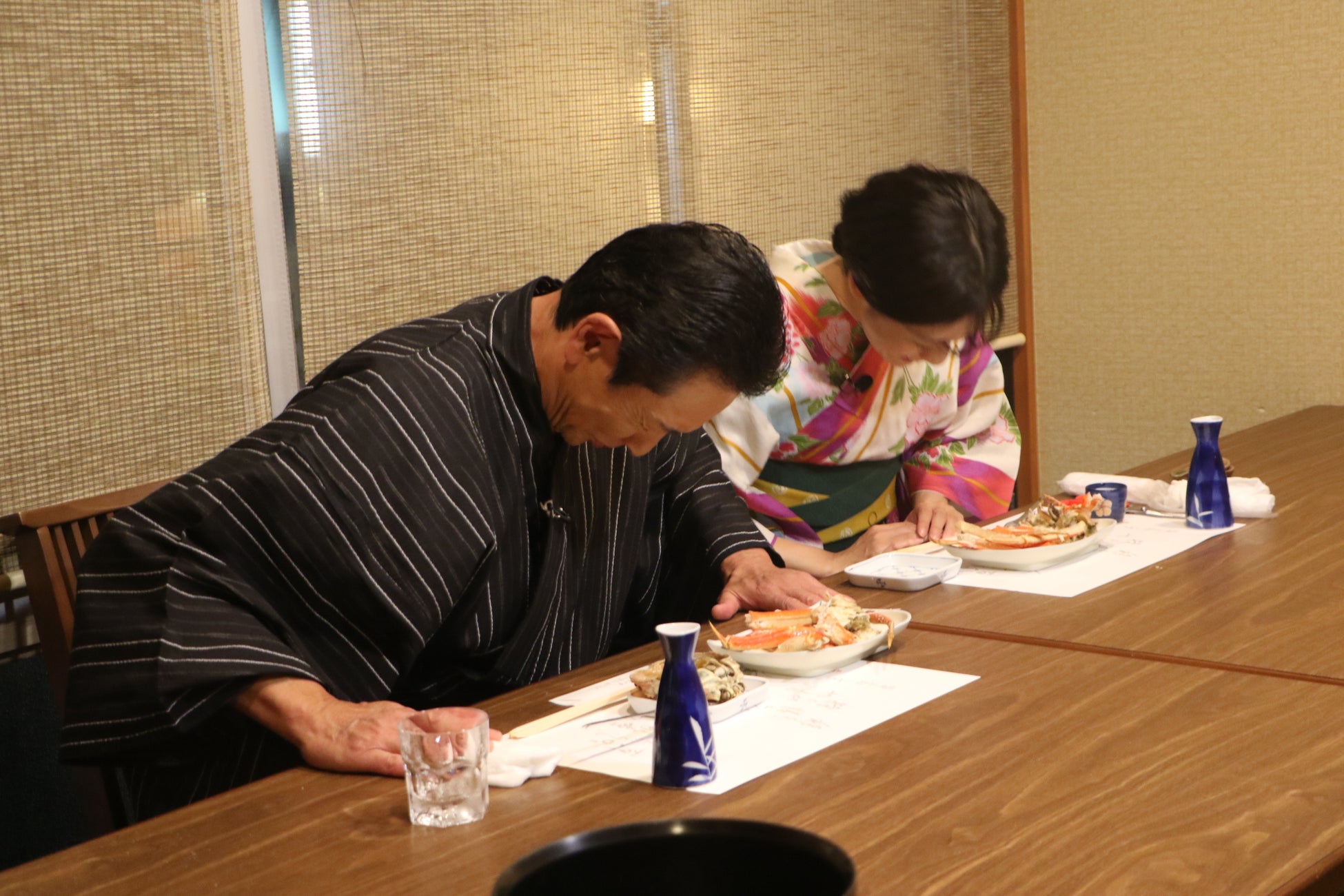 【心の宿 三國屋】にて、1人でカニが2杯も食べられる昼食をいただくことに。さっそく、甲羅酒にする三田村。