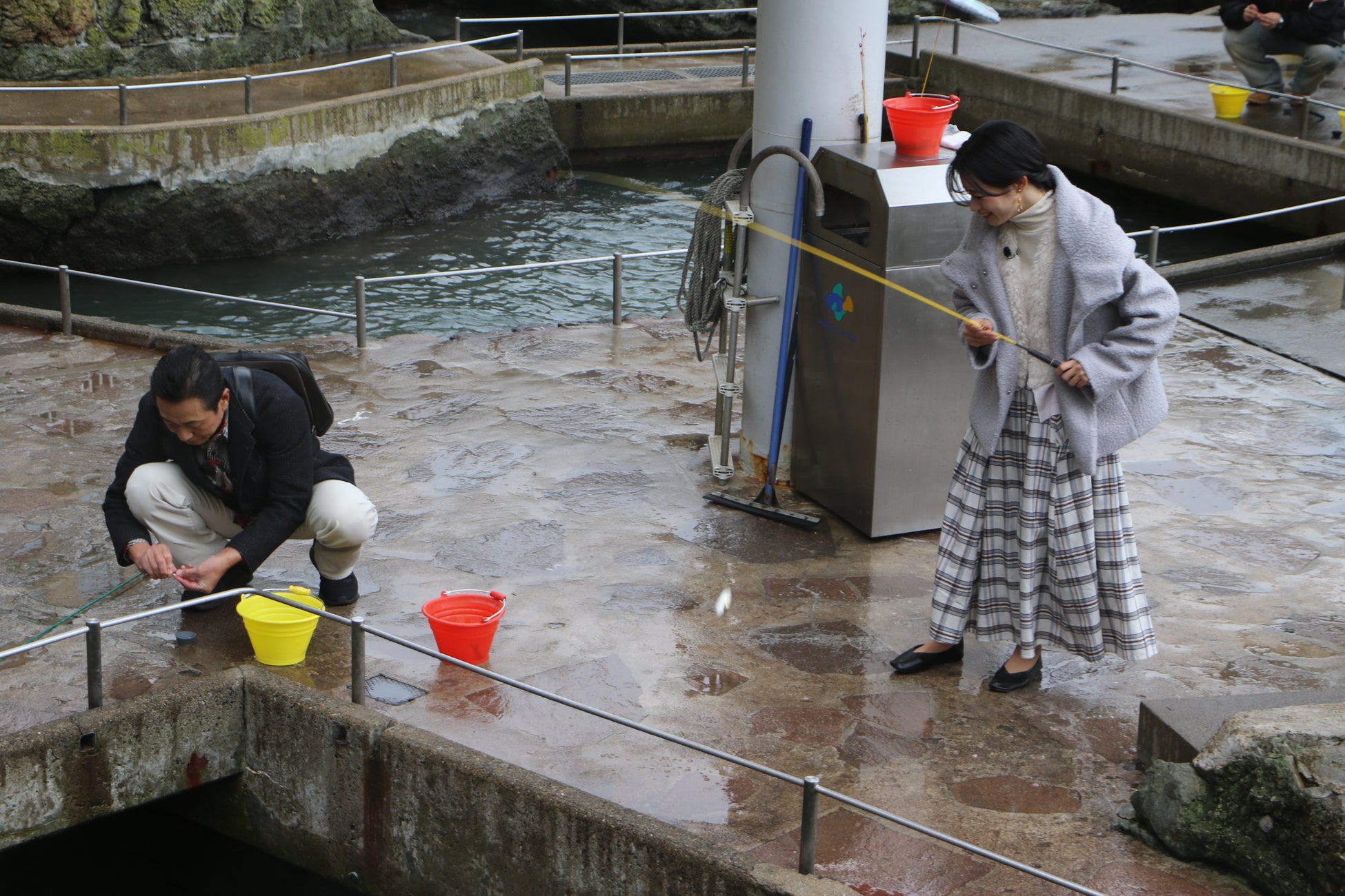きれいなお魚たちを鑑賞した後は、≪アジ釣り≫に挑戦です!対決をすることにした2人。針を垂らすだけですぐにかかる入れ食い状態!!はたして勝負の行方は?