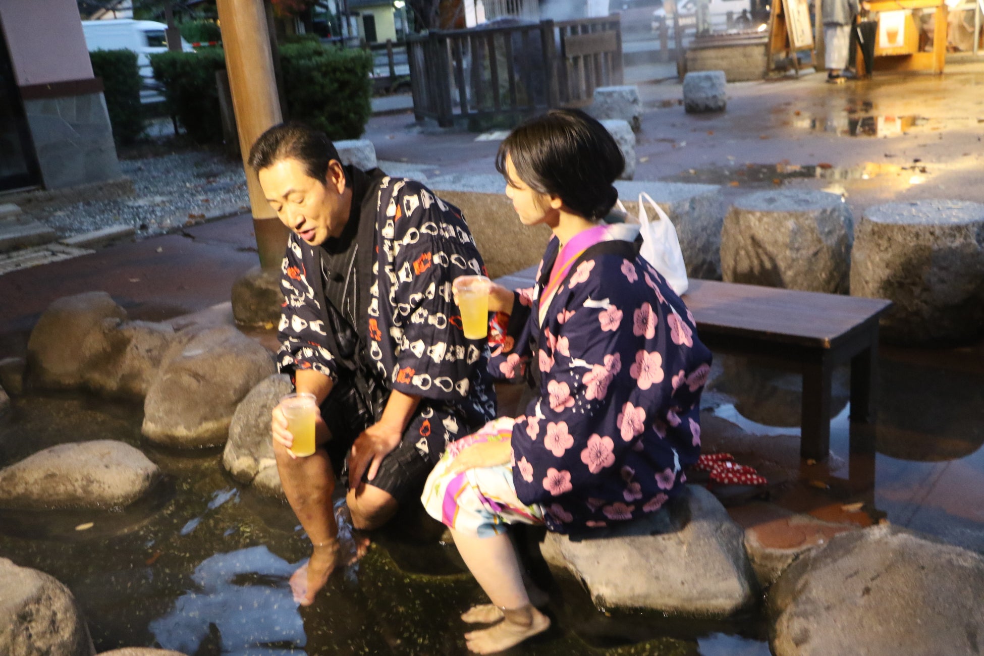 お酒も調達して温泉街ならではのスポット足湯へ!『ゆずハイボール』と足湯でまったり・・・?!