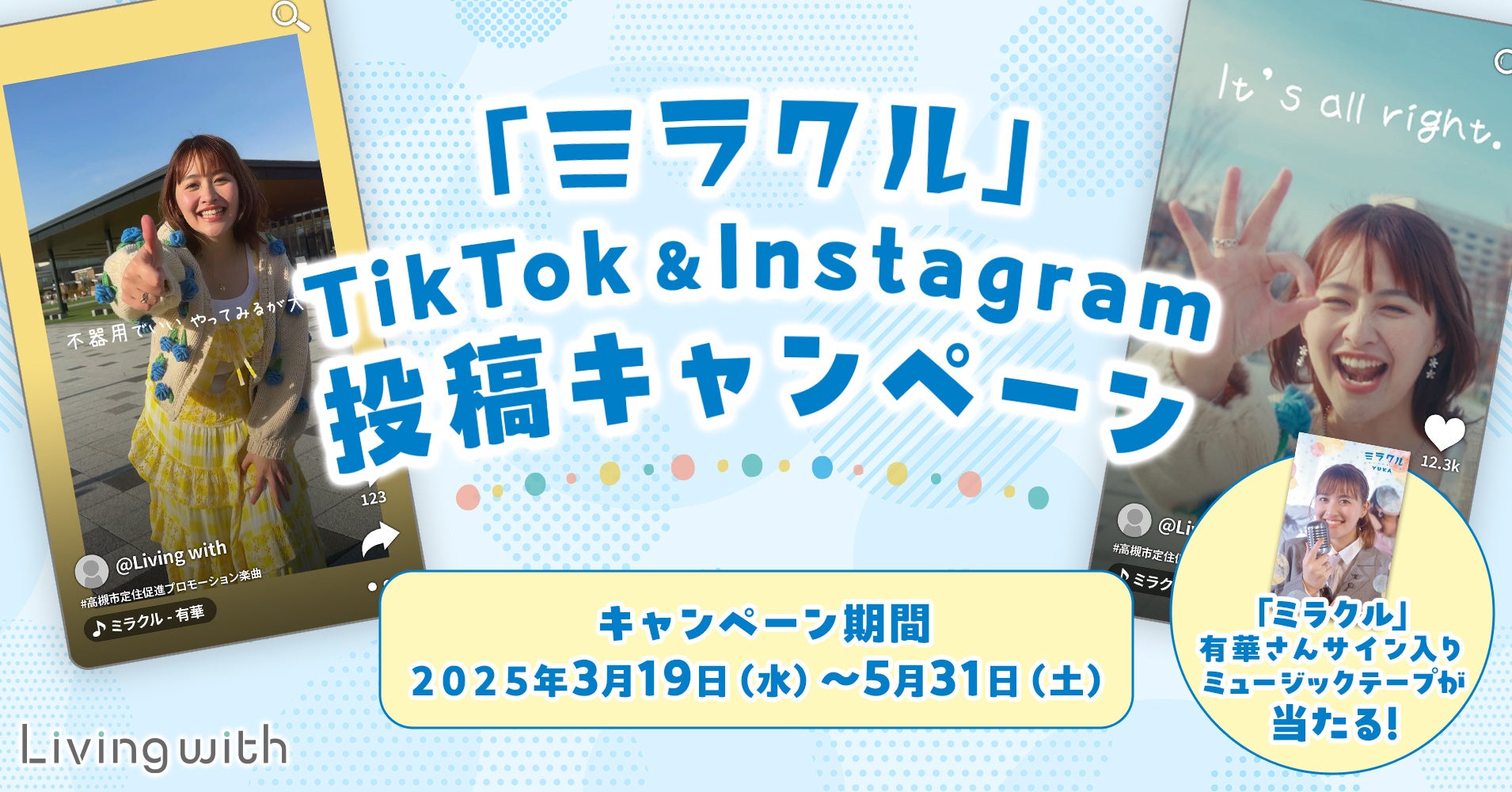 本キャンペーンでは、TikTokやInstagramのユーザーの皆さまに「ミラクル」を使用した動画を自由に投稿してもらい、それらを通じて「高槻市を知る」「高槻市に来る」「高槻市に住む」きっかけ作りを目指しています。