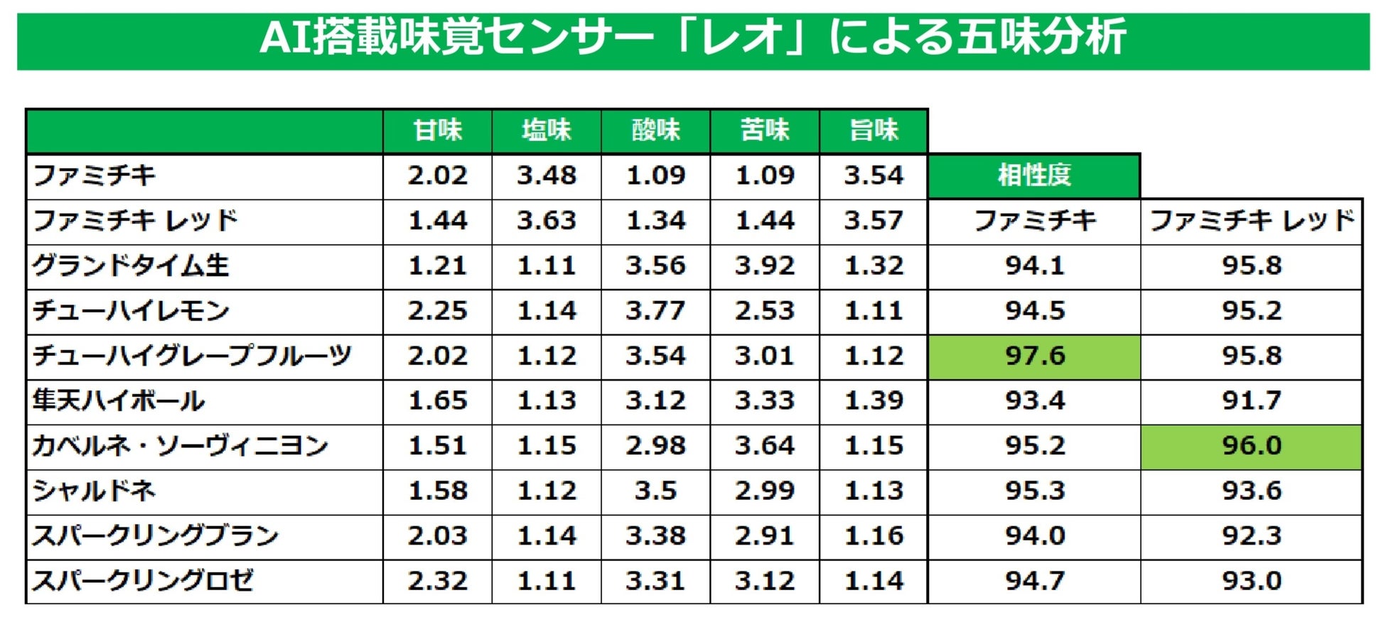 キャンペーンに合わせてAI味覚センサーを用いた「ファミチキ×お酒」のペアリング調査を実施し、ファミチキとの相性が最も良いお酒は「スーパーチューハイ グレープフルーツ 」、ファミチキ レッドとの相性が最も良いお酒は「カベルネ・ソーヴィニヨン」であることが判明しました。