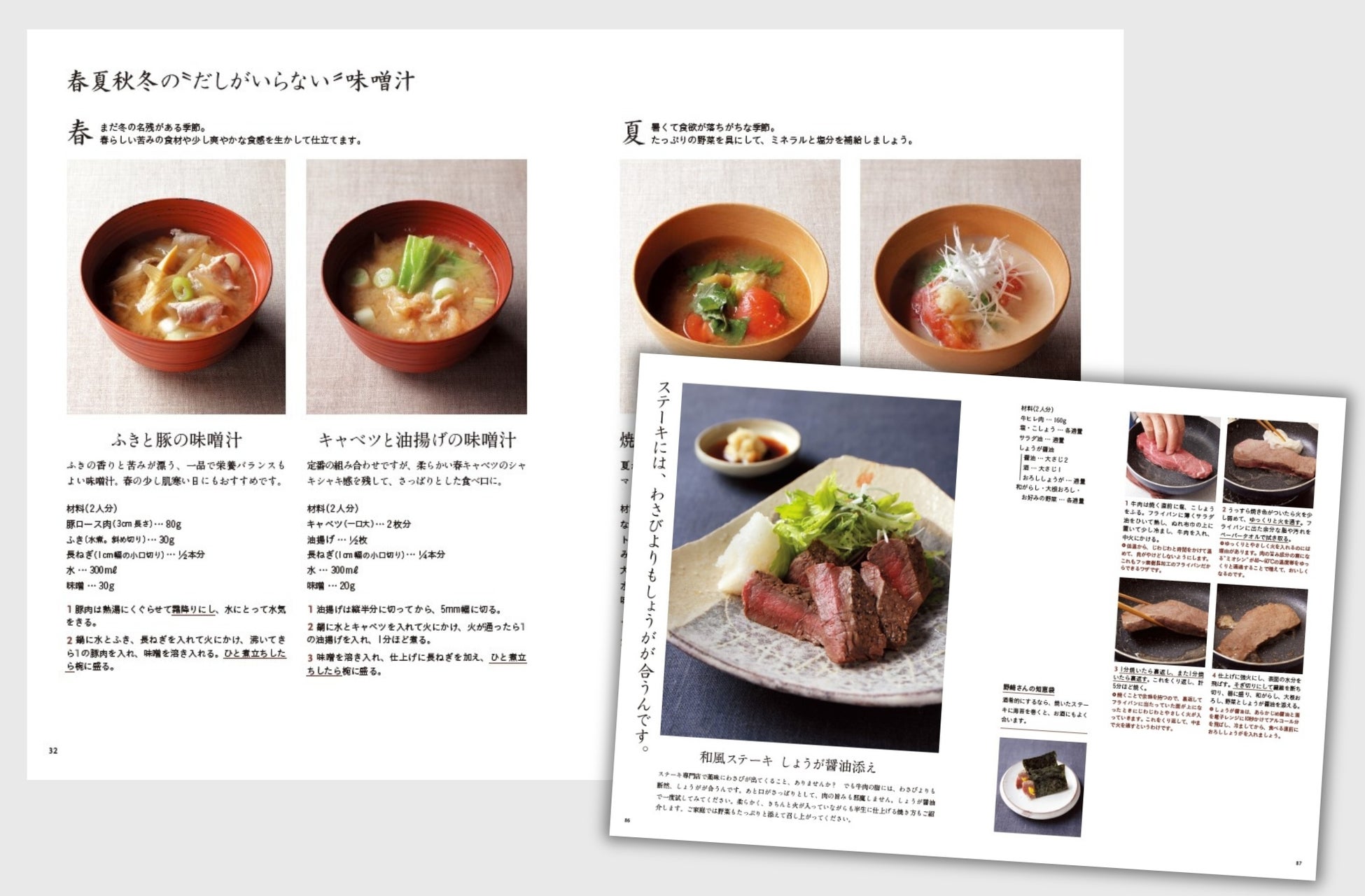 一番大切なのは「お箸で食べられること」。焼いただけの牛肉のステーキも、ひと口サイズに切ってあれば和食と言えるといいます。では、だしは必ず必要でしょうか?それも違います。江戸時代、家にかまどが1個あればよい時代にご家庭でだし汁をとれるわけがありません。だから「だしはなくてもいい」。そう考えると気が楽になりますね。本書ではそのようなお料理が満載です。