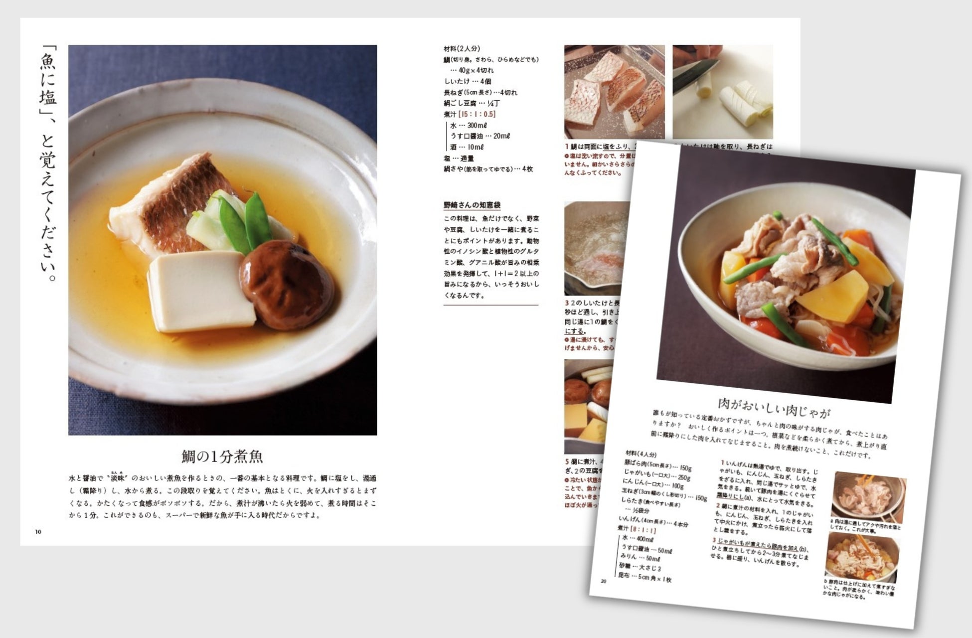 本書は、野﨑洋光さんが考える「今の時代の家庭料理」61品をご紹介。スーパーで新鮮な食材が手に入る時代だからこそ、食材がおいしく味わえるレシピを独自の理論で教えてくれます。たとえば「肉じゃが」。昔は衛生面も考えて、肉を炒めてからじゃがいもと一緒に煮込んだものですが、今は肉が新鮮なので、じゃがいもを柔らかく煮たら湯通しした肉を入れてなじませるだけ。肉の味がする肉じゃがです。野﨑さんが「家庭人」の目線で、多くの方に家庭料理を作ってほしいとの思いを込めた1冊です。