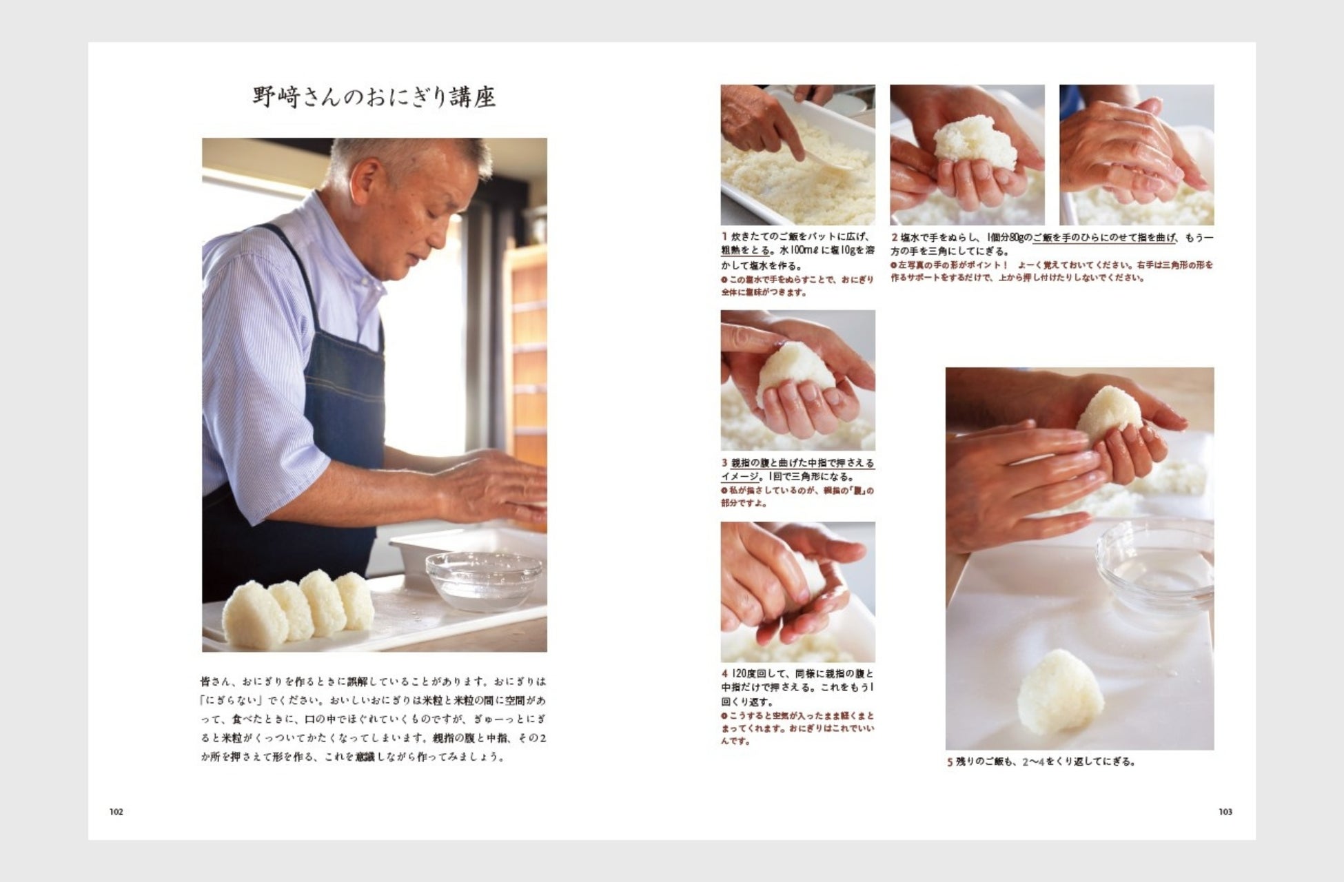 本書では、野﨑さんがご自宅で実際に食べている好きな料理もご紹介。ベスト料理は「とろとろ目玉焼きご飯」。卵白が固くならないようにやさしく加熱し、ご飯にのせて混ぜて食べるというもの。「すきやき」にもこだわりがあって、まず肉を堪能したら、次に野菜を食べて口内をリフレッシュし、また肉、野菜というように交互に食べていきます。そして、何よりも野﨑さんが好きなお米の代表料理「おにぎり講座」も必見です!