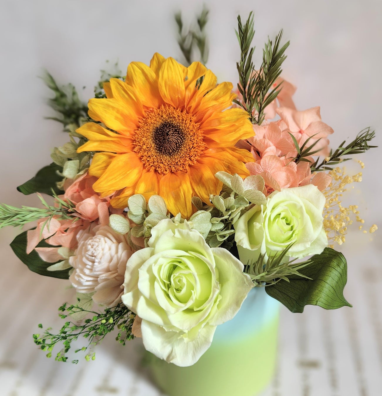 「ミントグリーンのバラとひまわりで作る爽やかプリザーブドアレンジ」