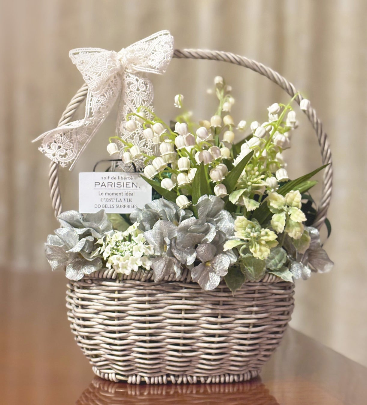 「新緑をイメージしたすずらんのバスケットアレンジ」