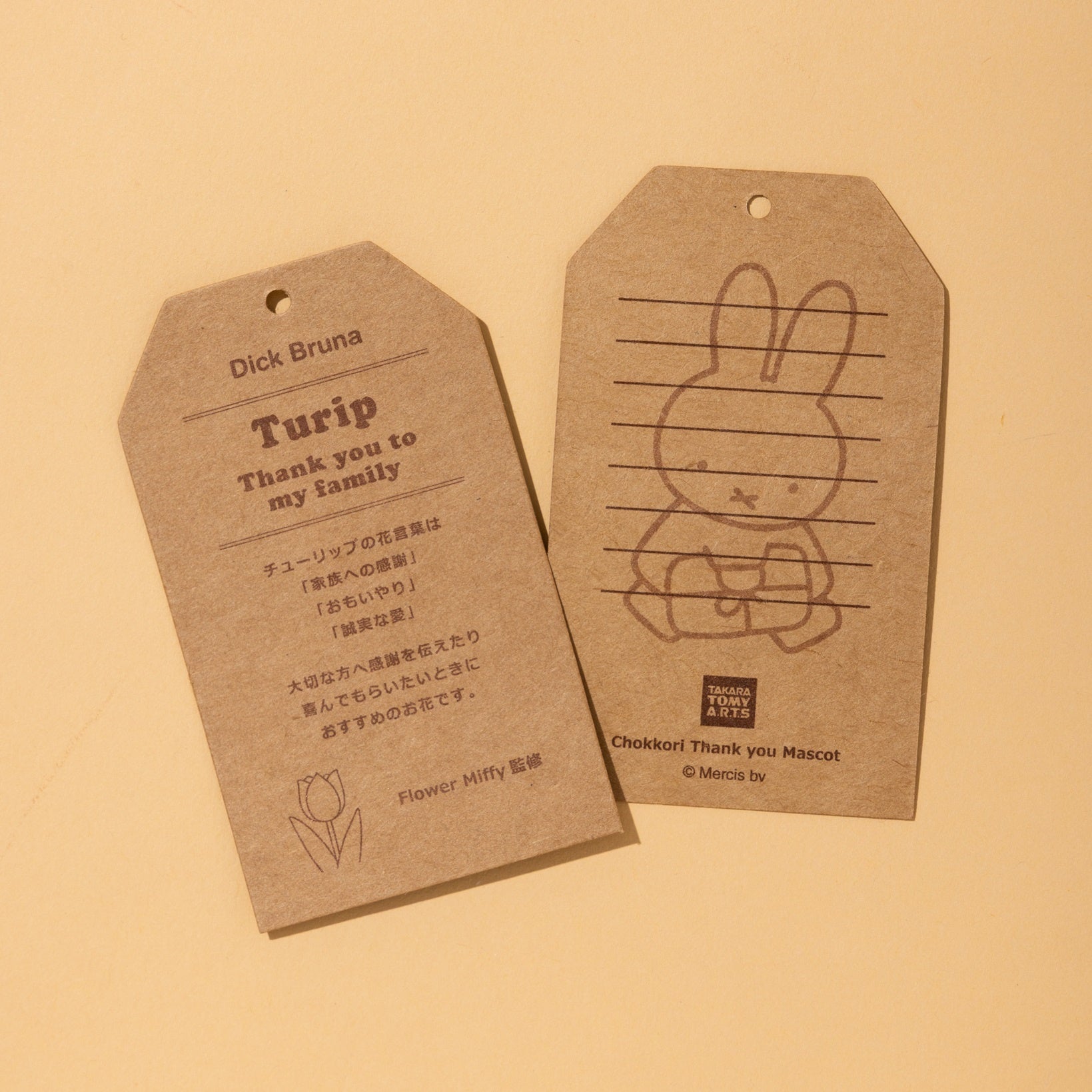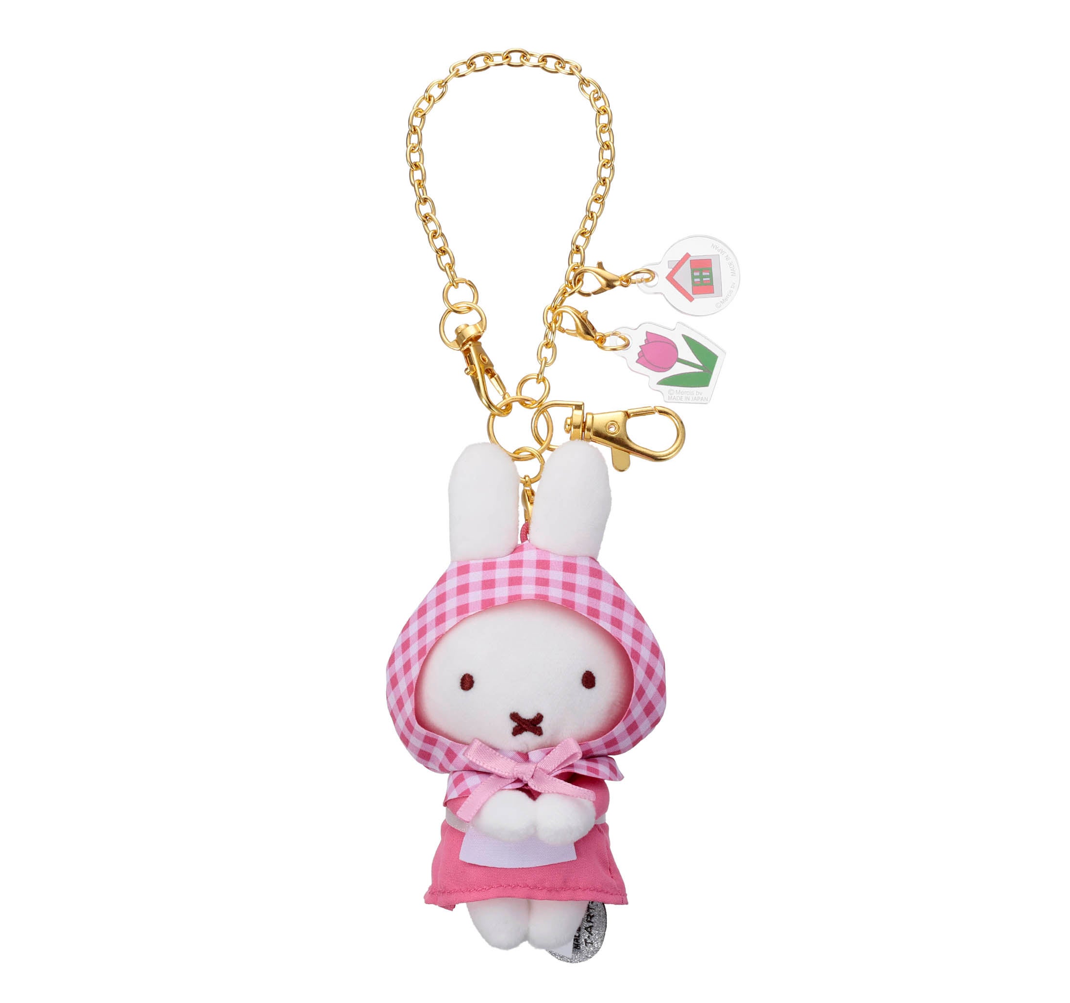 タカラトミーアーツ展開のぬいぐるみシリーズ「ブルーナちょっこりサンキューマスコット」に、ギンガムチェックの頭巾と白いエプロンを着用した新たなデザインが登場します。付属のクラフト製の紙タグに記載されている花言葉は、ミッフィーのお花屋さん「Flower Miffy」が監修しました。