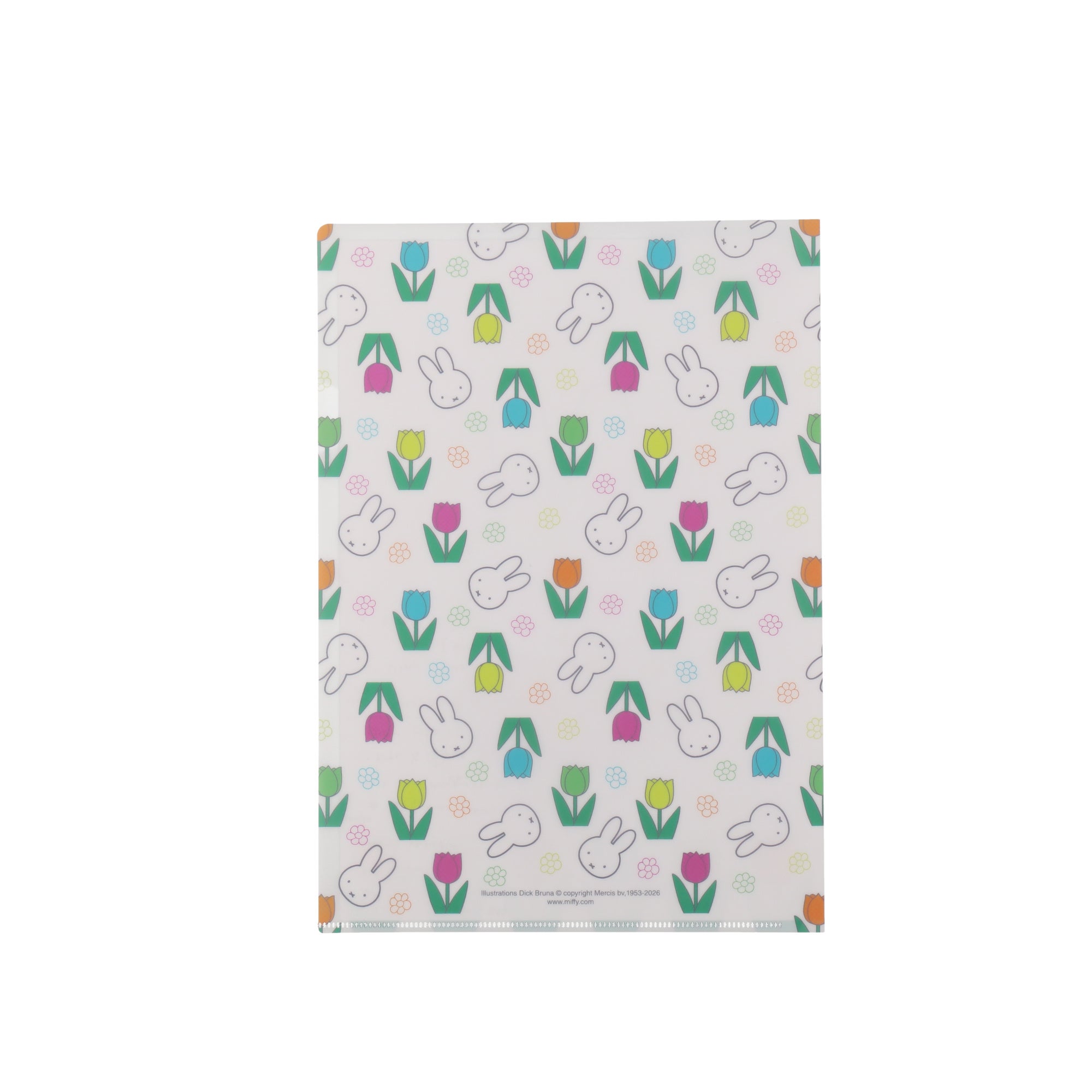 Flower Miffy POP UP SHOPのメインテーマ「チューリップの日」に合わせたデザインの、書類や郵便物をまとめるのに便利なクリアファイルです。表面はシンプルに、裏面は華やかな総柄の両面楽しめるデザインに仕上げました。Flower Miffy POP UP SHOP限定デザインが、コレクション心をくすぐります。