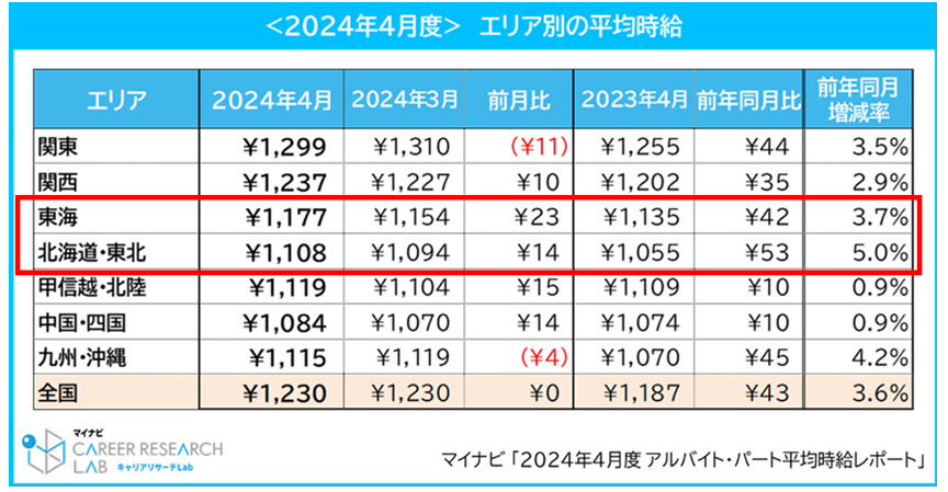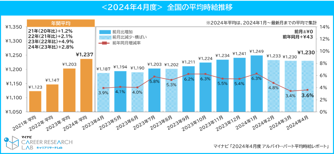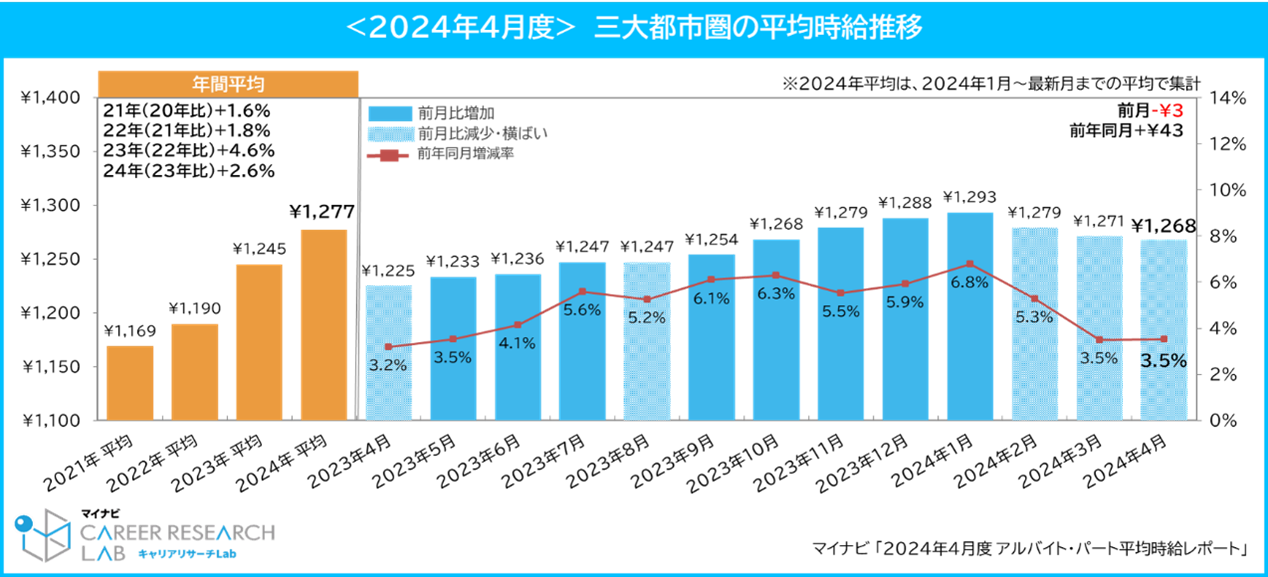 マイナビ、「2024年4月度アルバイト・パート平均時給レポート」を発表