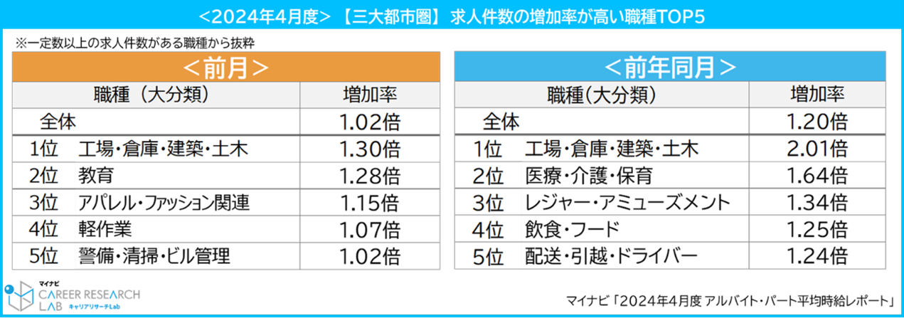 職種(大分類)別では、[工場・倉庫・建築・土木]が1,364円(前月比:68円増、前年同月比:117円増)で、2020年1月の調査開始以降で過去最高額となった。また、求人件数は前月比で1.30倍増、前年同月比で2.01倍増と、トラックドライバーの負担軽減を見据えた採用活動が三大都市圏でより活発化していることが考えられる。