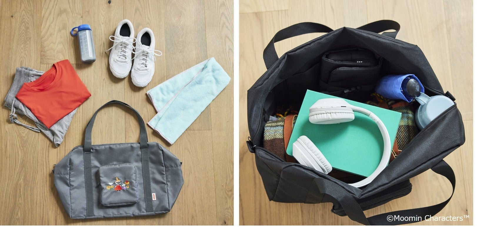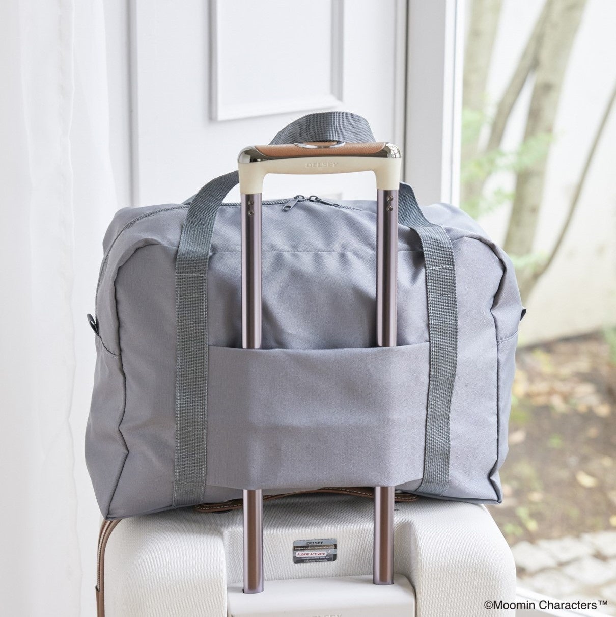 ビッグなボストンバッグは、ポケット部分に施されたリトルミイの刺しゅうが映えるデザイン。グレーとブラックの2色で、約25Lの大容量かつ軽量なので、旅行はもちろん、アウトドアやジムのスポーツバッグなどマルチに活躍します。背面にはループ付きで、キャリーケースにセットできるのが嬉しいポイント。小さく折りたたんで普段使いのバッグに入れておけば、荷物が増えたときのサブバッグにもなる心強いアイテムです。