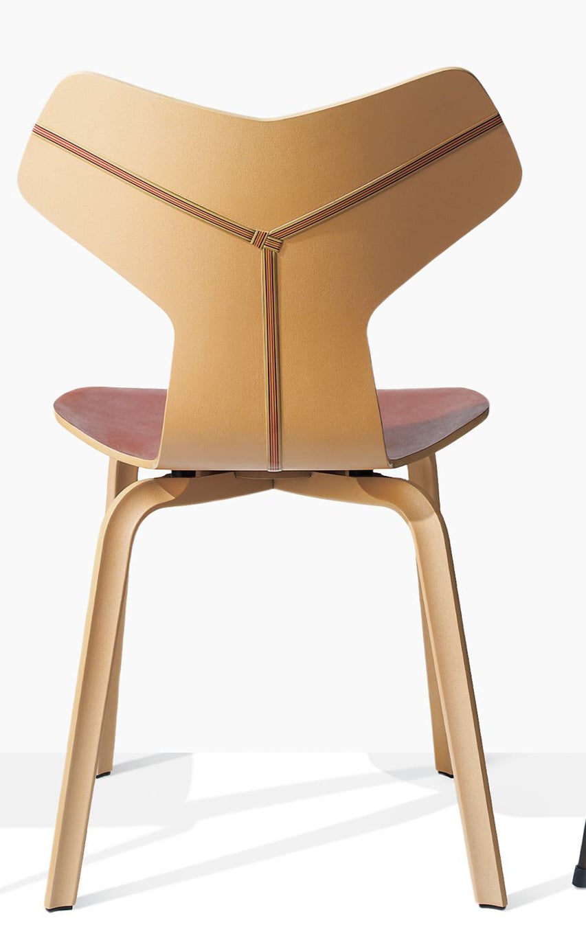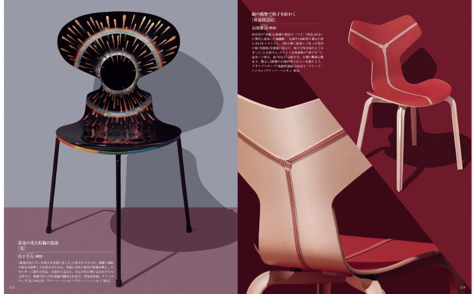 作品名の「堆漆」は彫漆の技法の一つで、「間道」は16~17世紀に渡来した縞織物。「色漆を120回塗り重ねた後に小口をスライスし、2枚を横に接着して作った帯状の板『堆漆板』を間道に見立て、椅子全体を結わえてみました」と石原さん。ポイントは堆漆板の“結び目”で、表は三つ葉文、裏は結び文。木製の脚部も艶あり、艶なし2種類の白漆が塗られている凝りよう。グランプリチェア「堆漆間道結」110万円/フリッツ・ハンセン(フリッツ・ハンセン 東京)