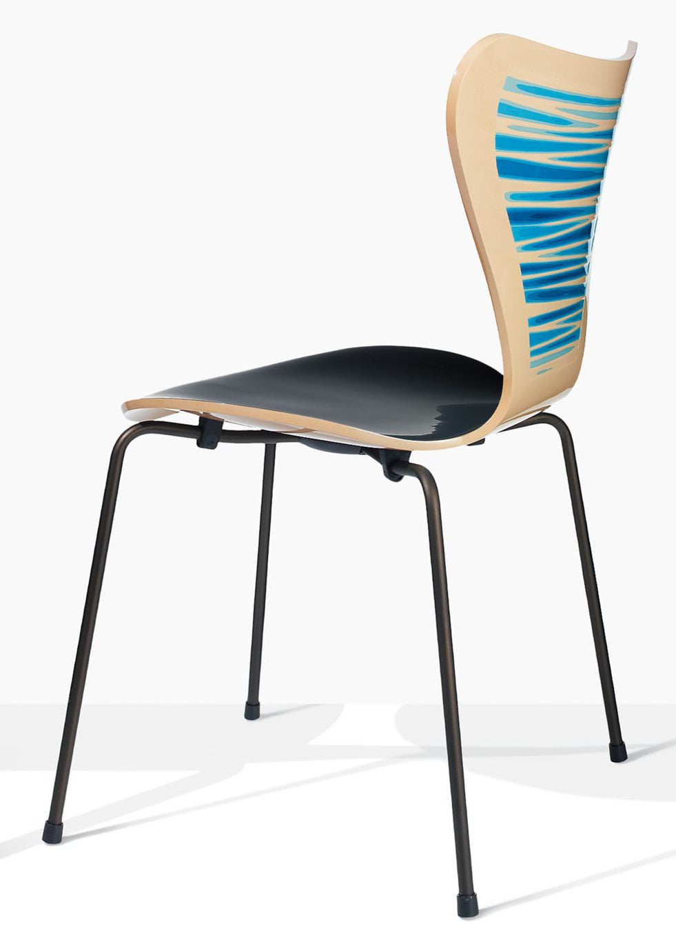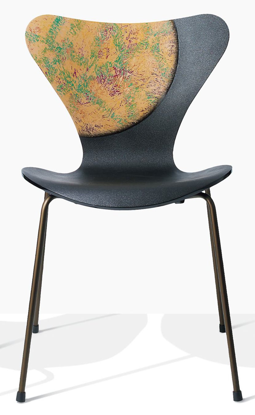 「自然の中の光と色彩をテーマに彫り、赤や緑など6色の色漆と錫粉、アルミ粉をランダムに埋めて研ぎ出しました。『蒟醤』の自由なタッチや質感を見ていただけたら」と藪内さん。「蒟醤」は漆を塗り重ねて文様を彫り、その溝に色漆を埋めたのち、表面を研いで文様を表現する技法。セブンチェア「impression」110万円/フリッツ・ハンセン(フリッツ・ハンセン 東京)
