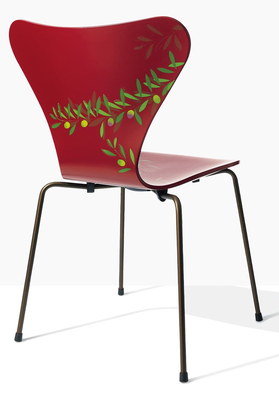 うるみ色(赤みがかった茶色)のマットな漆に、聖書に平和の象徴として登場するオリーブを描いた。使用技法は「存清」で、漆を塗り重ねた上に色漆で文様を描き、細部に線彫りを施す。「風にゆれるオリーブの残像を表すため、輪郭を少しずらして線彫りし、金を埋めました」と辻さん。セブンチェア「平和の実り」110万円/フリッツ・ハンセン(フリッツ・ハンセン 東京)