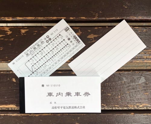 ことでんの現行の車内乗車券をイメージした1冊50枚綴りメモ帳です。