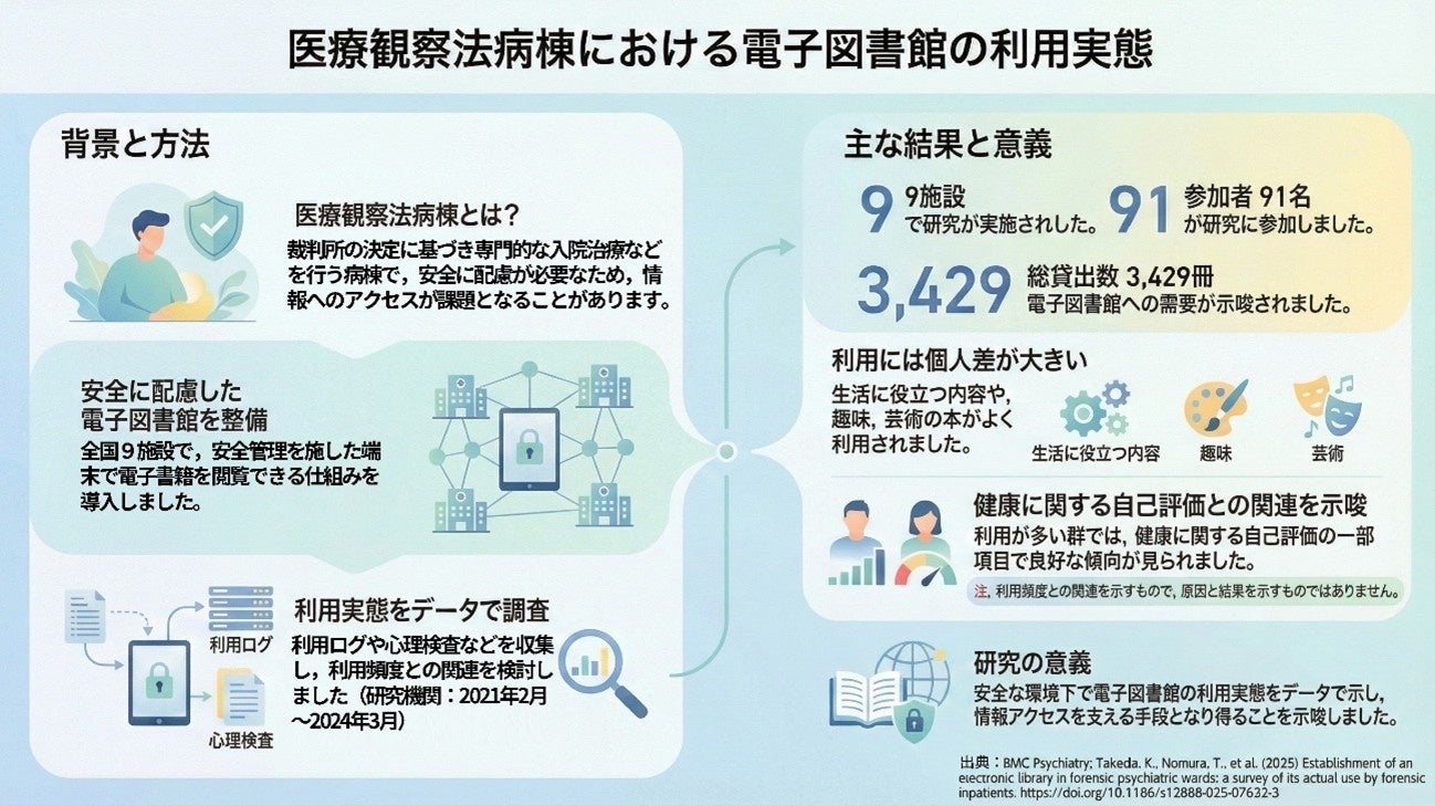 医療観察法病棟では、安全配慮の観点からインターネット利用や読書の機会が制限されやすい一方で、情報へのアクセス不足が社会復帰を妨げる要因となることが指摘されています。本研究では、こうした環境下において、電子図書館が実際に利用され得ることを示すとともに、安全性に配慮しながら入院患者の情報アクセスを支える手段となり得る可能性を明らかにしました。
