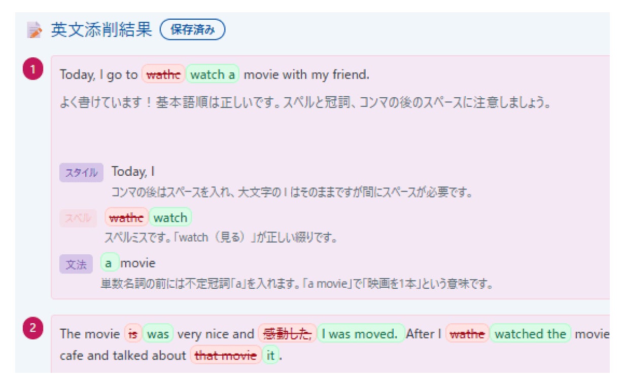 AIによる自動添削は、生徒がライティング完了後、すぐに画面に表示されます。添削は、CEFER準拠のレベル設定に対応しており、レベルに合わせて解説も調節されます。