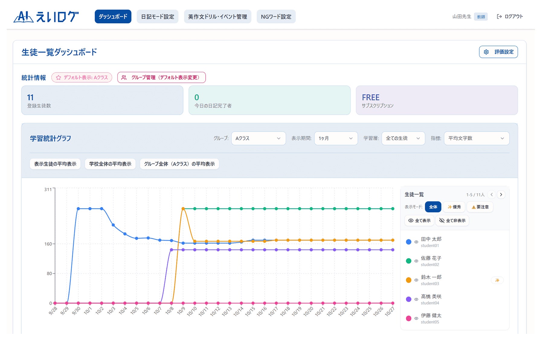 産経ヒューマンラーニング株式会社(本社:東京都新宿区、代表取締役:中谷友紀、以下「当社」)は、 AI英語日記サービス「えいログ」の提供を、2026年4月より開始いたします。本サービスは、生徒が身近な話題について英語で日記を書き、最新のAI技術により即座に自動添削フィードバックが得られる、教育機関向けの英作文学習サービスです。生徒の自律的な学習を促進するとともに、先生方は生徒の学習状況をリアルタイムで把握し、より効果的な指導に集中できるようになります。また「英作文ドリル」機能では、先生が英作文の問題やテーマを設定できるため、英検対策などの自由英作文はもちろんのこと、授業中になかなか時間をかけられない教科書のライティングパートをドリルとして出題するなど、生徒一人ひとりの回答に個別で添削ができるだけでなく、授業時間の効率化にも繋がります。「日記」・「ドリル」のどちらでも充実の管理画面により、評価業務など先生の負担を軽減します。