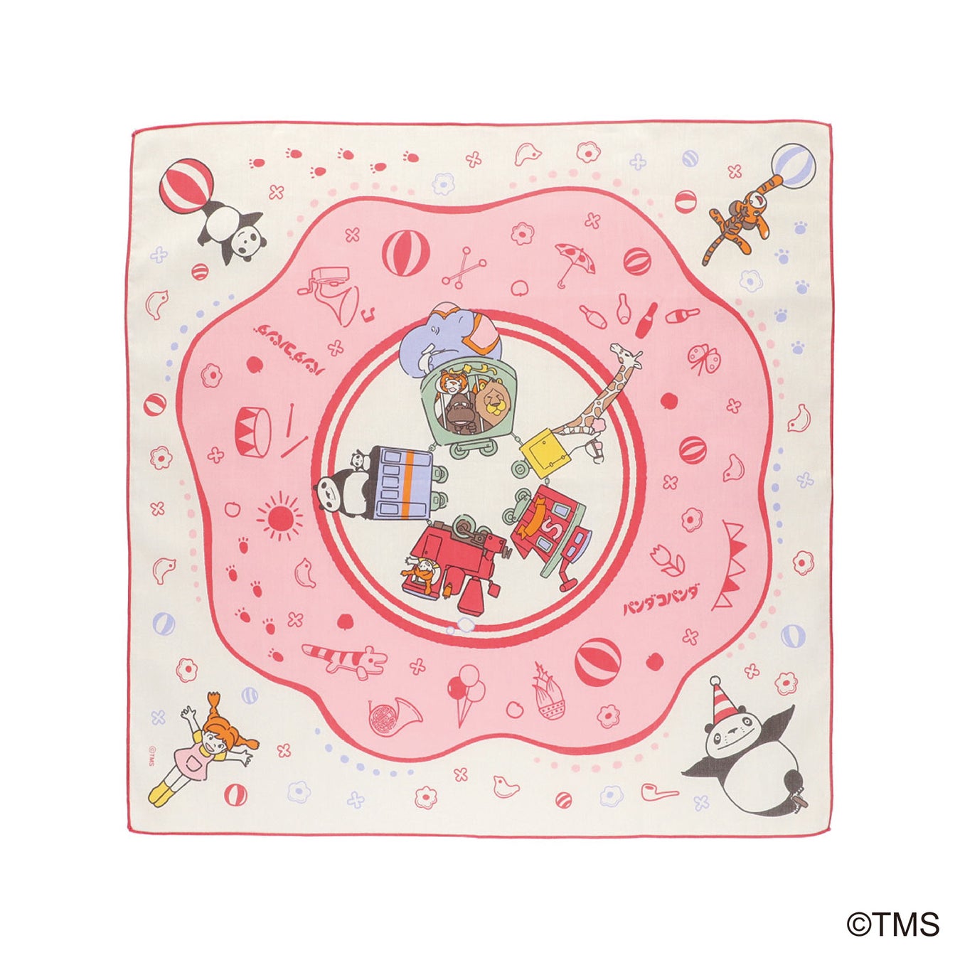 生地の端を赤色の糸で縁取ったメロー巻きと、あたたかな色合いがノスタルジックな印象を与える、大判ハンカチが登場します。全体にサーカスで使用する道具やトラちゃんクッキーなどのアイコンを散りばめ、四隅にはミミ子、パパンダ、パンちゃん、トラちゃんがサーカスの一芸を披露、中心にはサーカスの動物たちも汽車に乗っているポップなデザインに仕上げました。