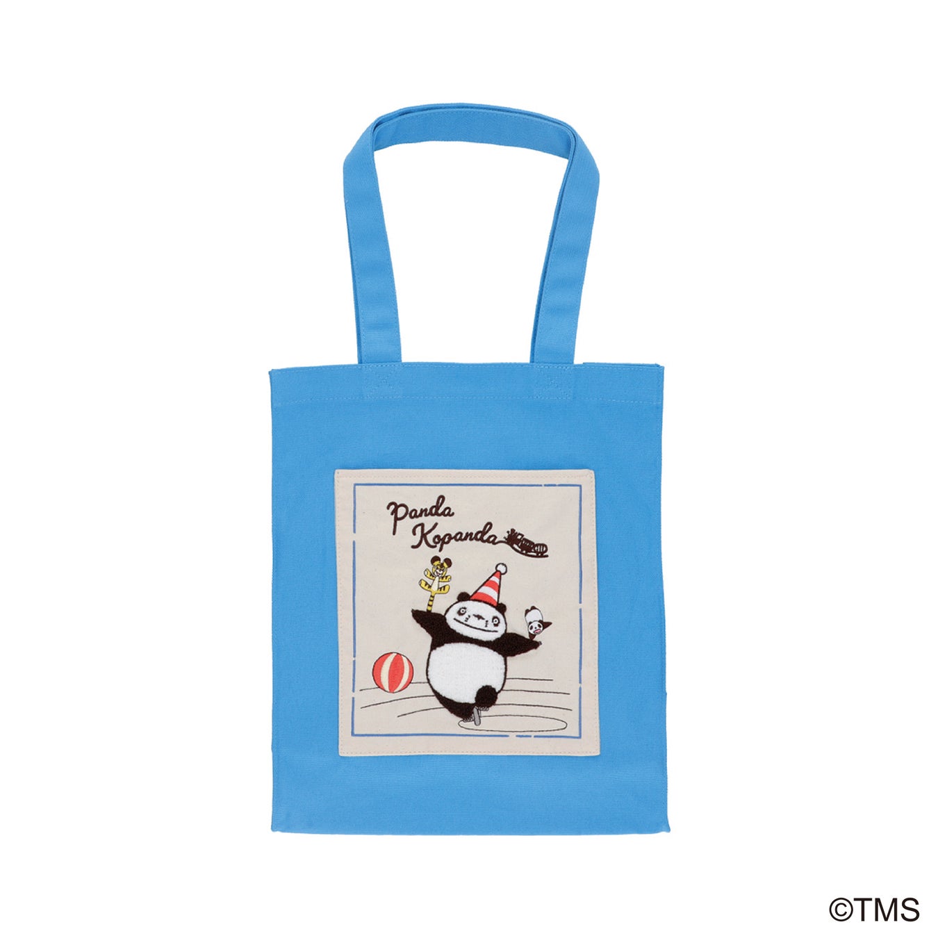 鮮やかなブルーの生地にパパンダ、パンちゃん、トラちゃんをデザインした大きめなポケット付きのトートバッグです。刺しゅうした英語の作品名には汽車が隠れていたり、パパンダはサガラ刺しゅうで、もこもことした触り心地になっていたりと遊び心のある商品です。マチ付きのA4サイズの書類やクリアファイルなどが入るサイズで、外側のデザイン部分に大きめなポケット、内側にはハンカチや小物が入る大きさのポケットも付いています。通学やお出かけにもおすすめです。