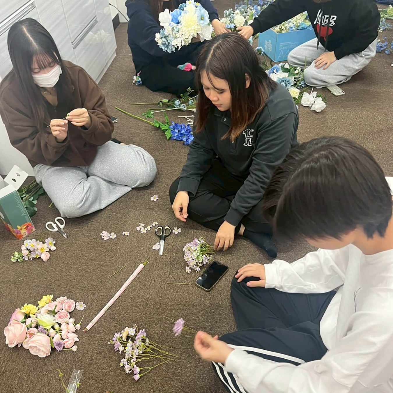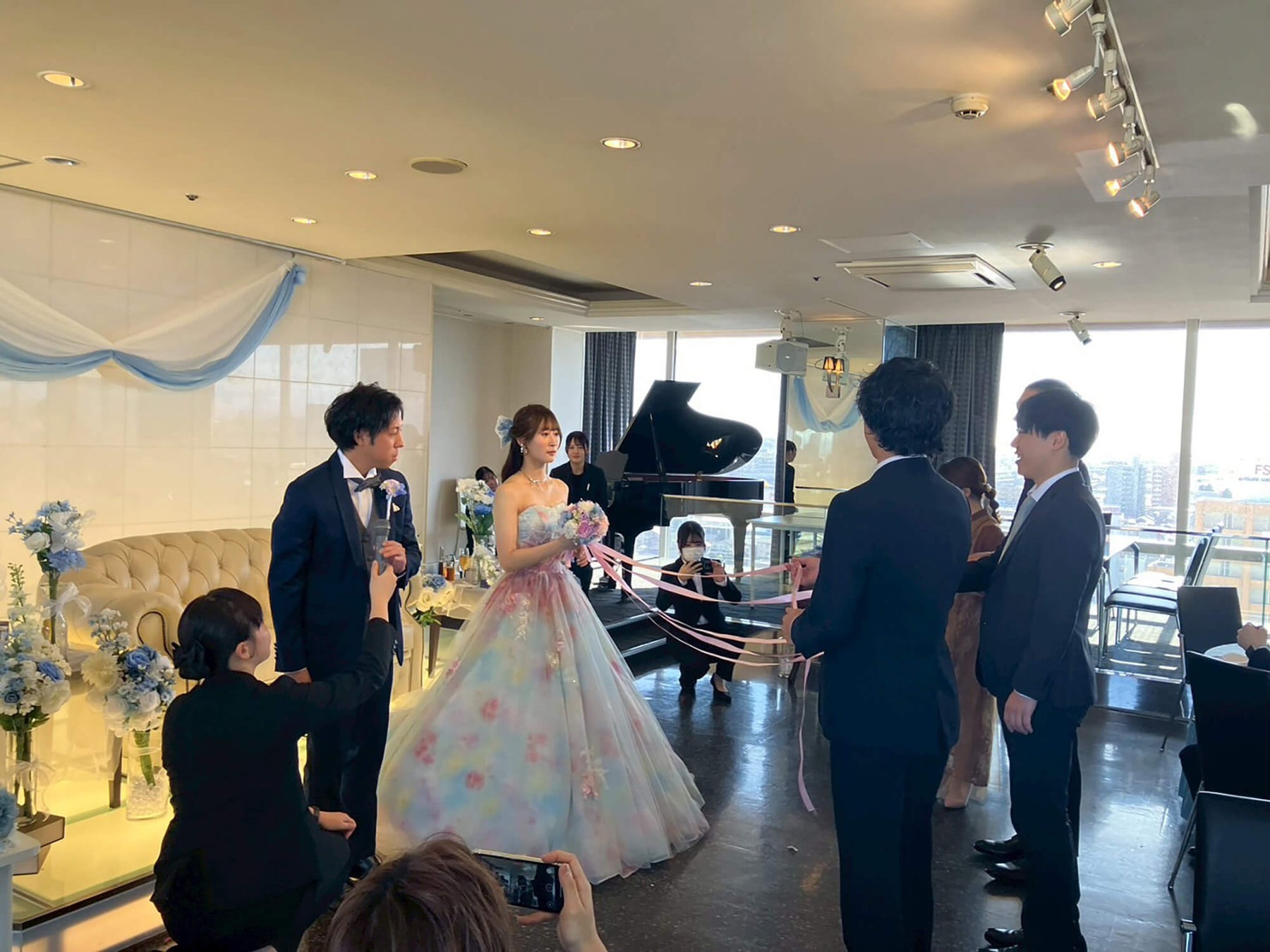 学生たちは複数回の打合せを重ね、新郎新婦のイメージを丁寧にくみ取りながら、招待状・会場装飾・ブーケ・オープニング映像・プロフィール映像に至るまで、すべて手作りで準備を進めてきました。