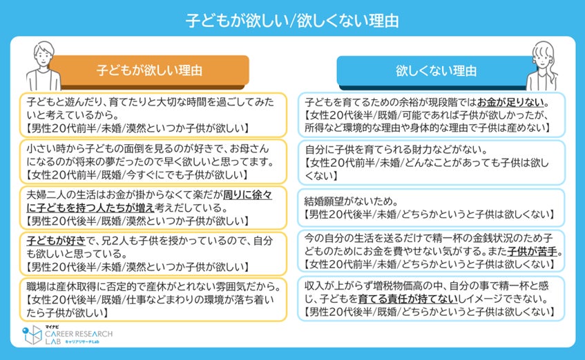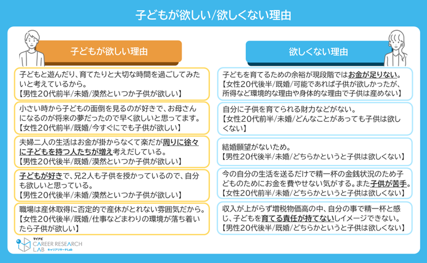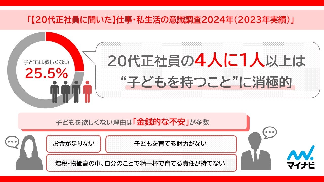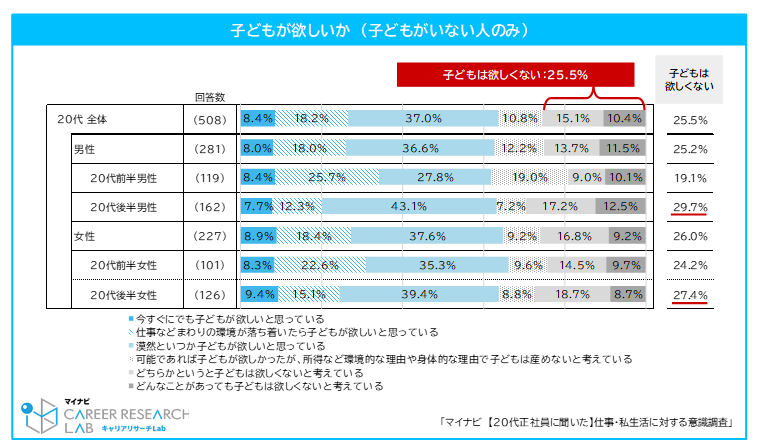 この変化により、昇給が不確実になるなど、経済的な不安を抱える若年層が増加した可能性があります。今回の調査では、子どもがいない20代正社員の4人に1人以上が子どもを持つことに消極的であることがわかり、その理由の多くが金銭面の不安によるものでした。