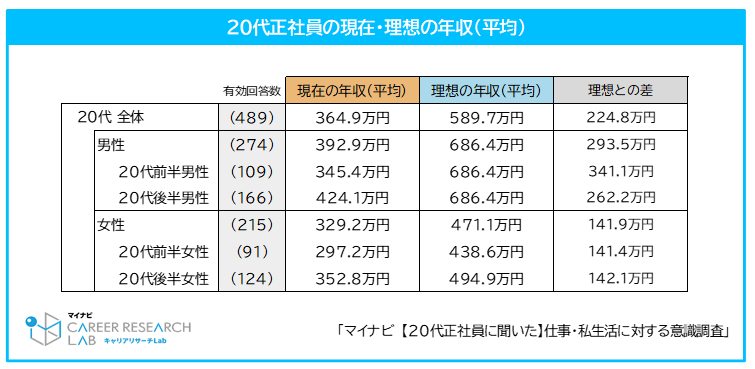理想の年収を聞いたところ、平均589.7万円となった。一方で、実際の年収は、平均364.9万円となり、理想と現実の差は224.8万円だった。