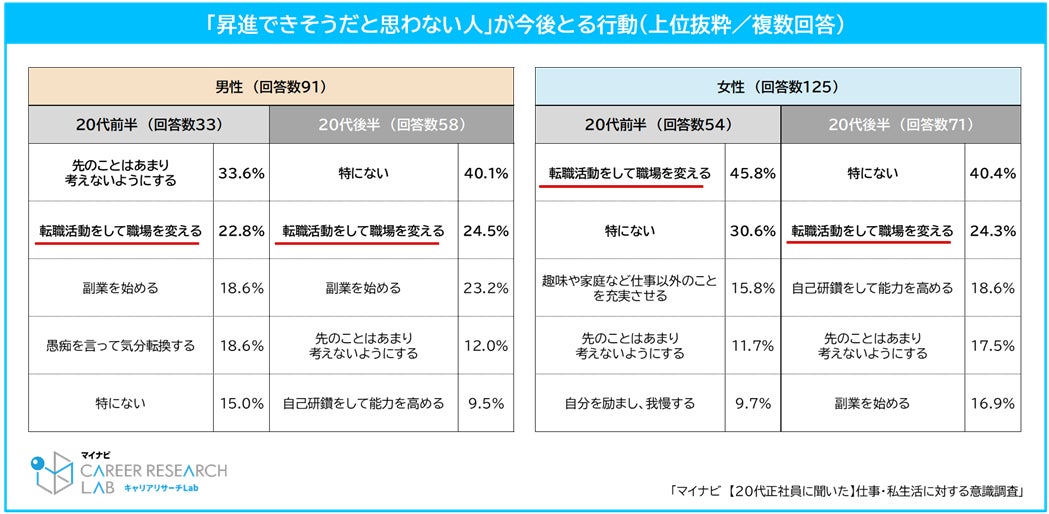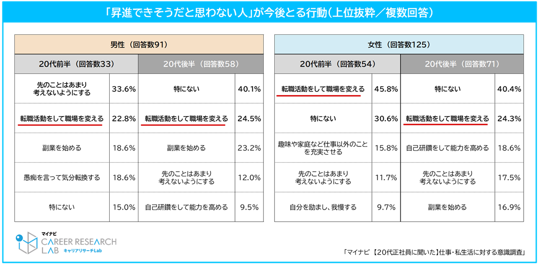 「昇進できそうだと思わない」人に今後どのような行動をとるか聞いたところ、【20代前半の女性】は「転職活動をして職場を変える」という回答が45.8%で最多だった。他の20代でも「転職活動をして職場を変える」と回答した割合は上位となっており、昇進の可能性を感じるかどうかは20代の転職意欲に関わっているようだ。【図3】