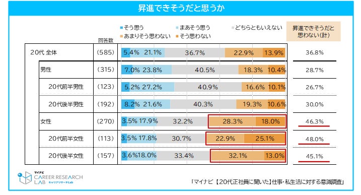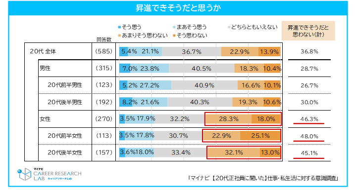20代女性正社員の約半数は今の会社で「昇進できそうだと思わない」と回答し、男性と大きな差。昇進の可能性を感じるかどうかは、20代の転職意欲にも影響【図2、3】
