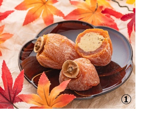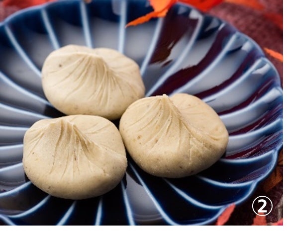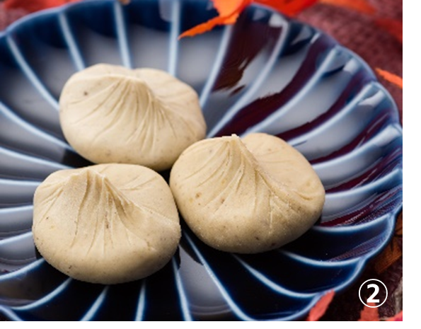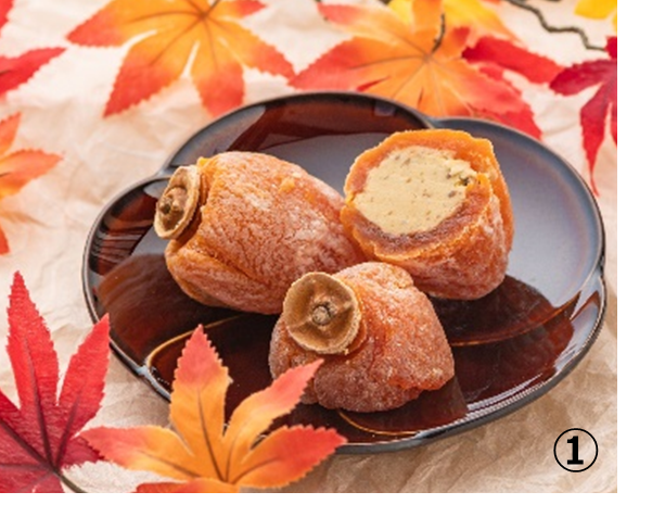 ①干し柿の中に自慢の栗きんとんをいれた贅沢な和菓子。