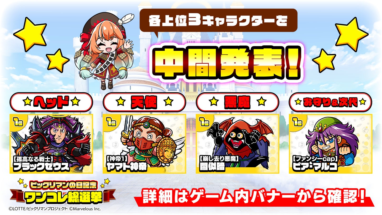 投票ページにて各部門の1~3位を公開しておりますので、ゲーム内バナーからぜひご確認ください♪
