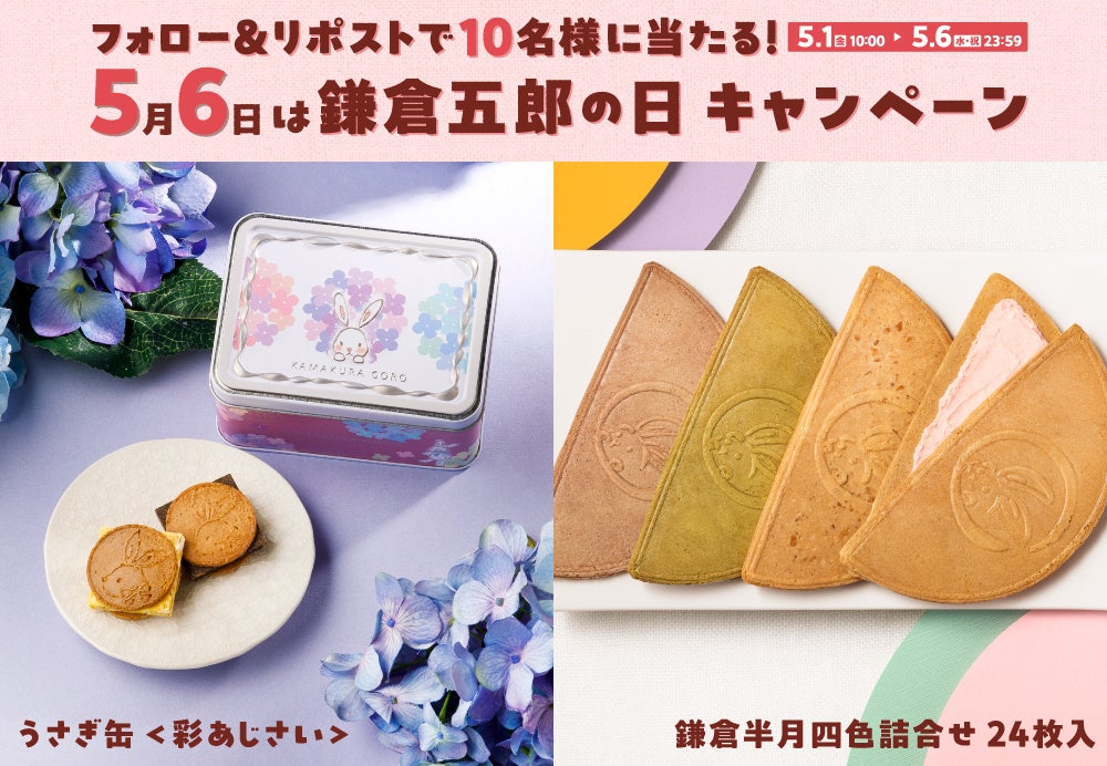 株式会社鎌倉座(本社:神奈川県鎌倉市)が展開する「鎌倉五郎本店」は、『うさぎ缶<彩あじさい>』を新発売。さらに5月6日の「鎌倉五郎の日」を記念し、2026年5月1日(金)~5月6日(水・祝)のゴールデンウィーク期間中、対象店舗にて税込1,620円以上お買い上げのお客様に代表銘菓『鎌倉半月(小倉風味)』を1枚プレゼントいたします。