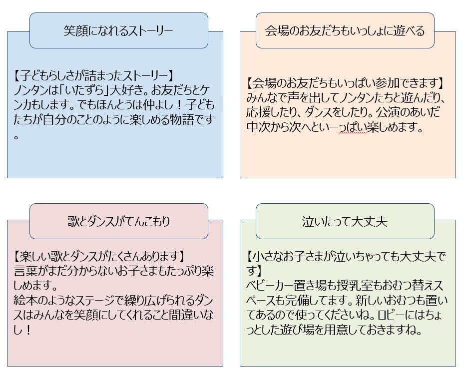 ノンタンとお友だちが、会場のみんなといっしょにピクニックへ出発!楽しいうたとダンスがてんこもりで、小さなお子さまも安心して楽しめる舞台です!